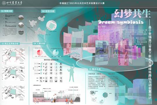 由低调看球-低调jrs看球app 主办,低调看球-低调jrs看球app 环境设计系承办的第一届“幸福温江-公共空间装置艺术设计大赛”在今年9月举行。此次比赛以”幸福温江”为主题,对比赛要求的公共空间为设计场地,以装置的形式呈现设计;作品表现方式不限,渲染软件不限,具体功能、灯光和材质均可以自由发挥。比赛持续时间约为2个月,参赛的同学约有120余名,主要来自于低调看球 ,其他低调看球 也有部分同学积极报名参加,参赛同学们于2021年11月20日提交比赛图纸。经过老师们认真细致的层层评选,选出较为优秀的近13份设计方案进入复赛。复赛答辩于2021年11月26日晚19:00举行,低调看球 潘远智院长、姜贝贝副院长、环境设计系李倩副教授、陈诗雨、邓兰馨等老师评选出此次比赛的一等奖1组、二等奖3组、三等奖5组及优秀奖4组。