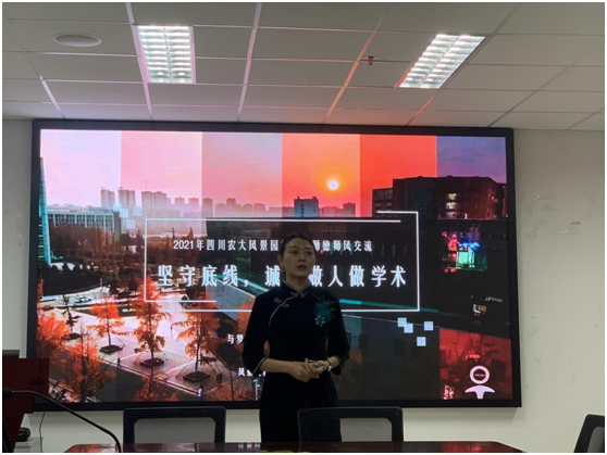 随后,高素萍以《坚持底线,诚信做人做学术》为题做了专题报告。从诚信是学术界最不应缺失的品质出发,结合学术不端案例,分析学术不端原因,告诫每一位老师,做学术一定要不忘初心、责任当头、不为诱惑,在学术路上不要存有侥幸心理,不要急于求成、急功近利,不盲目追求热点,紧抓自己的主干方向。高素萍从社会层面和个人层面进行剖析,提出了如何践行学术诚信,认为“内信于心,外信于人”,是每个人自立于天地间的基本道德。最后,高素萍深切寄语,希望每位教师都要与梦偕行,恪守学术道德、学术诚信,寻找更好的自己。