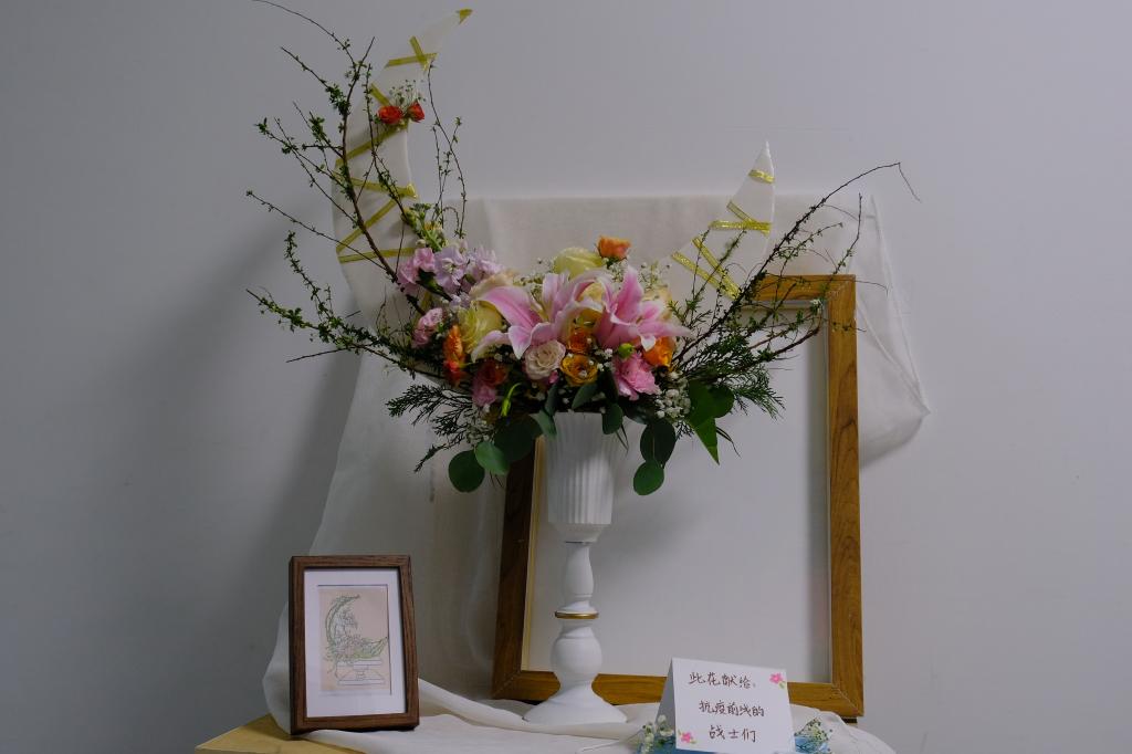 下午一点,参赛队员们陆续携带花材入场。工作人员有条不紊的进行短暂的参赛规则解说后,各小组按照自已在初赛中提供的花艺设计稿进行现场制作,在3个小时内完成了作品。各个参赛队伍在比赛中淋漓尽致的展现了团结互助精神,队员们积极交流,尽力思考如何才能最大还原设计稿,表达作品内涵,致敬那些在疫情抗战中的逆行者们。