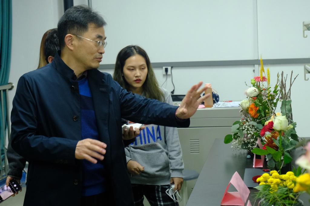 所有完成的作品整齐陈列在实验室中,由专业课教师潘远智教授、江明艳教授、姜贝贝教授进行现场评分。评委老们从作品完成度,色彩搭配,花材形态,创意及作品内涵等方面对参赛作品进行了点评。20个小组的参赛作品脱颖而出,这些花艺作品将在11月2到4日于成都校区图书馆进行展览和微信线上大众投票。评委老师分数和大众投票分数将按比例进行折算,最后决选出入围决赛的15支队伍。