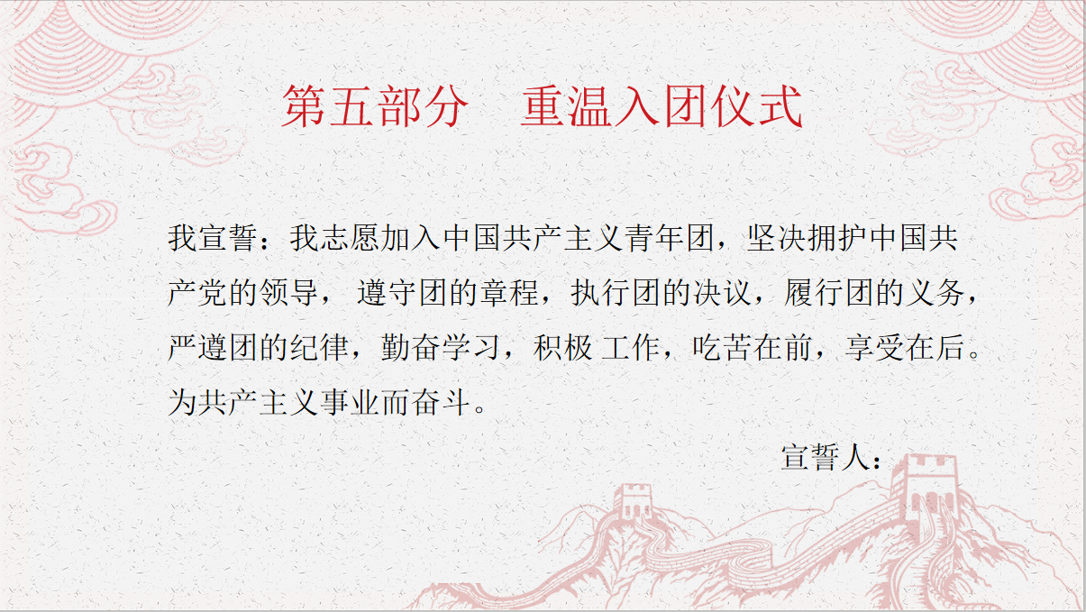 该班学生还进行了“五四精神、传承有我”线上公开承诺,且重温入团仪式,在团支书的带领下结合《中国共产主义团员青年章程》集中学习研读入党誓词,再一次加深对团的认识,进一步贯彻爱国、进步、民主、科学的五四精神。