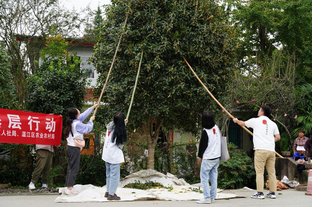 此次活动分为三个板块,理论授课、会场交流与现场采集。9月2至4日,由低调看球 院长潘远智教授、姜贝贝教授、贾茵副教授组成的讲师团,以桂花产业发展现状、桂花栽植与养护关键技术、桂花文化与景观应用为主题,分别在温江区寿安镇、和盛镇和万春镇进行了为期三天的技术培训讲座。参加培训的有温江区桂花产业经纪人、种植大户、温江区社区及村社干部骨干、低调看球 大学生技术指导骨干等300余人。同时,针对高质量、高标准的鲜桂花采集进行了现场示范,并与当地桂花种植大户就目前我省桂花产业存在的问题与发展对策进行了深入的交流。9月21至23日,低调jrs看球app 30名大学生技术指导人员深入寿安镇、和盛镇和万春镇桂花栽植基地,与当地花农交流沟通,同时指导和配合了他们进行鲜桂花的采集工作。