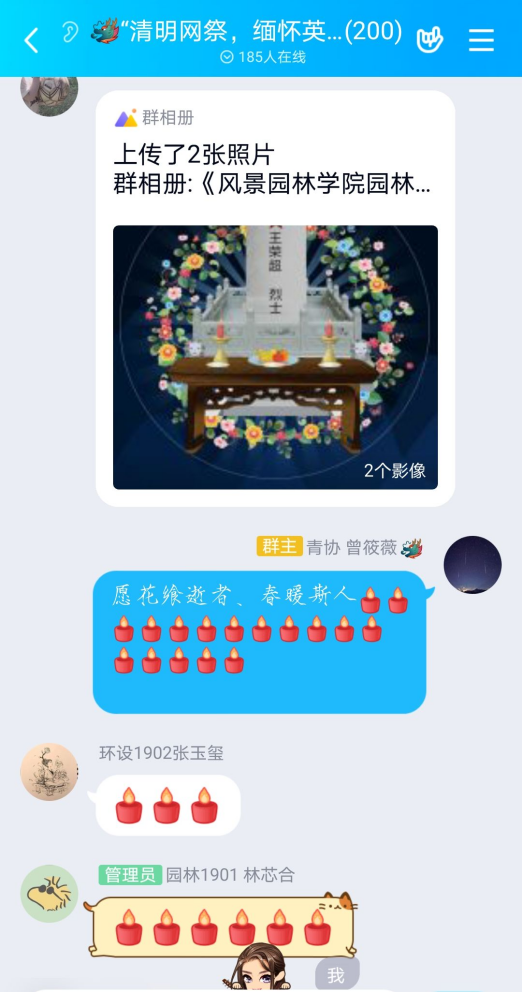 当记者采访到活动组织者赖同学时,她开心的说到:“本次活动考虑了当下疫情防控情况,采取网上祭祀的方法,保证志愿者安全的同时,希望志愿者利用现有资源,表达对革命先烈的敬意。同时活动希望增强同学们的民族自豪感和民族自信,在这个迎接挑战的关键时刻,对我们战胜疫情充满信心。活动进行很顺利,志愿者们十分热心与积极。”