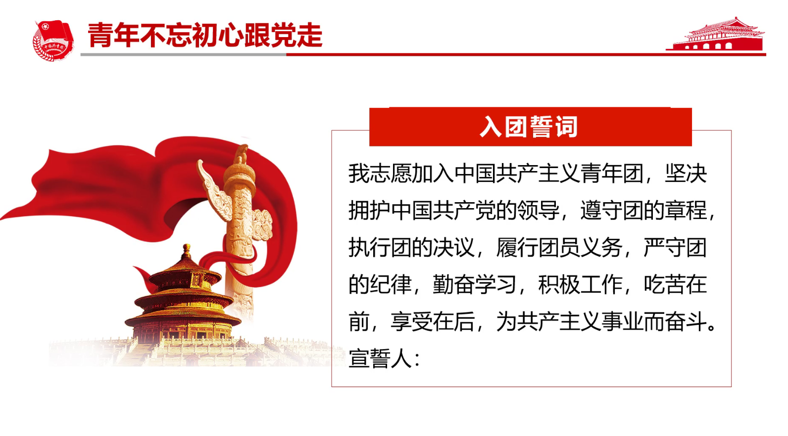 在观看《后浪》的演讲视频时,一句“奔涌吧,后浪”让参会人员不禁热血沸腾。由主持人带领,各位团干又结合《中国共产主义青年团章程》集中学习研读入团誓词,深刻理解入团誓词含义,明确青年团员的责任与义务。随后的由屏幕与屏幕对接方式制作的一个团徽视频也无不展示着满满的正能量。