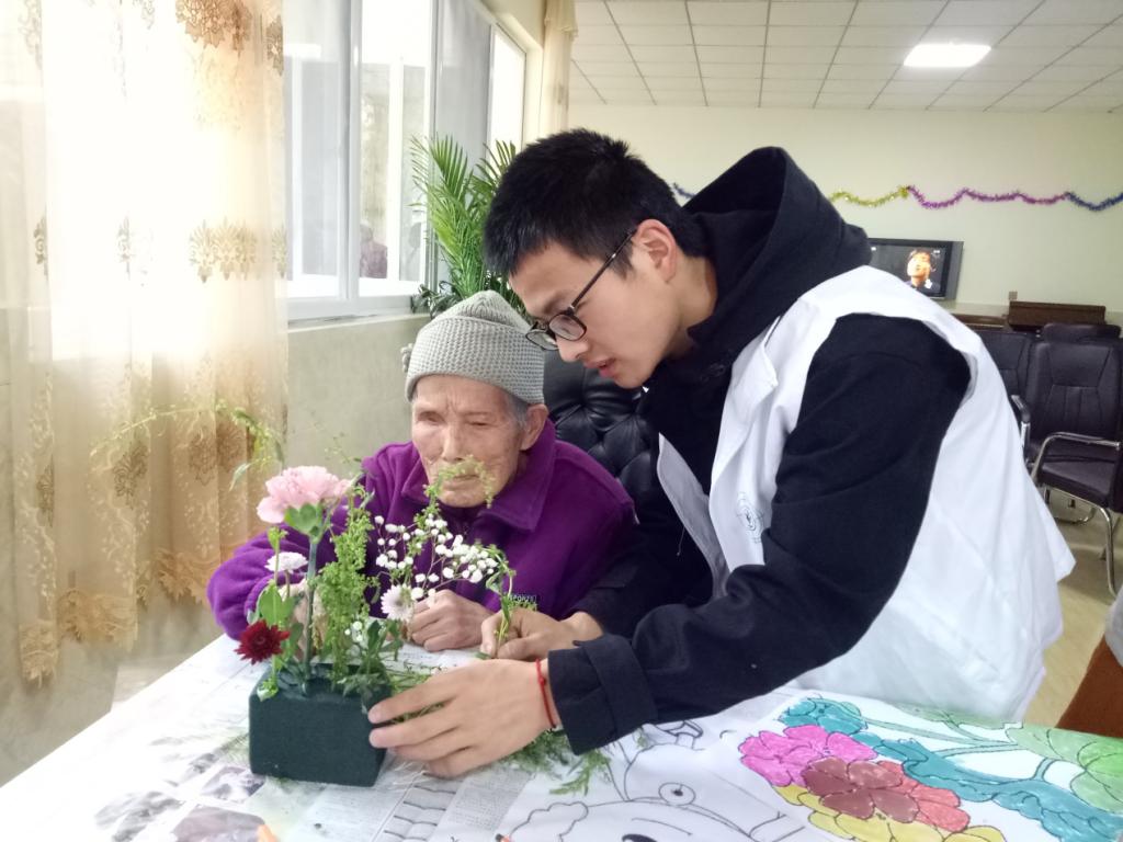 在老人们完成了涂色之后,志愿者们把老人们分成了三人一组,再拿出了事先准备的花和插花泥,带着老人们插花。淡粉色的康乃馨,白色的满天星与青绿色的枝条组成了一个个清新淡雅的插花作品,老人们都对这富有生机的小花们有着浓烈的喜爱,得知作品可以自己保留之后,有的婆婆还开心的把花抱回卧室嘟囔着要“放在衣柜上”。看着插花作品的郑在理爷爷回忆起了从前:“我以前是生产二队的,我们当时种了很多花,又大又漂亮。当时看见花苗变成树,花骨朵越变越大到最后开了花,心里面就美滋滋的。我的孩子们也像那些花苗一样,不知不觉就长这么大了,一个个都成才了。我的大儿子是航空学校毕业的飞行员,孙子也当了飞行员,有着这么厉害的儿孙,我心里也美滋滋的”。