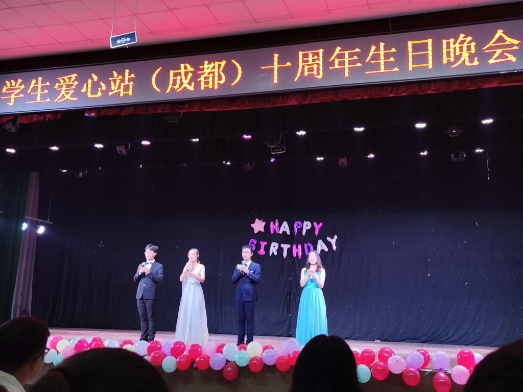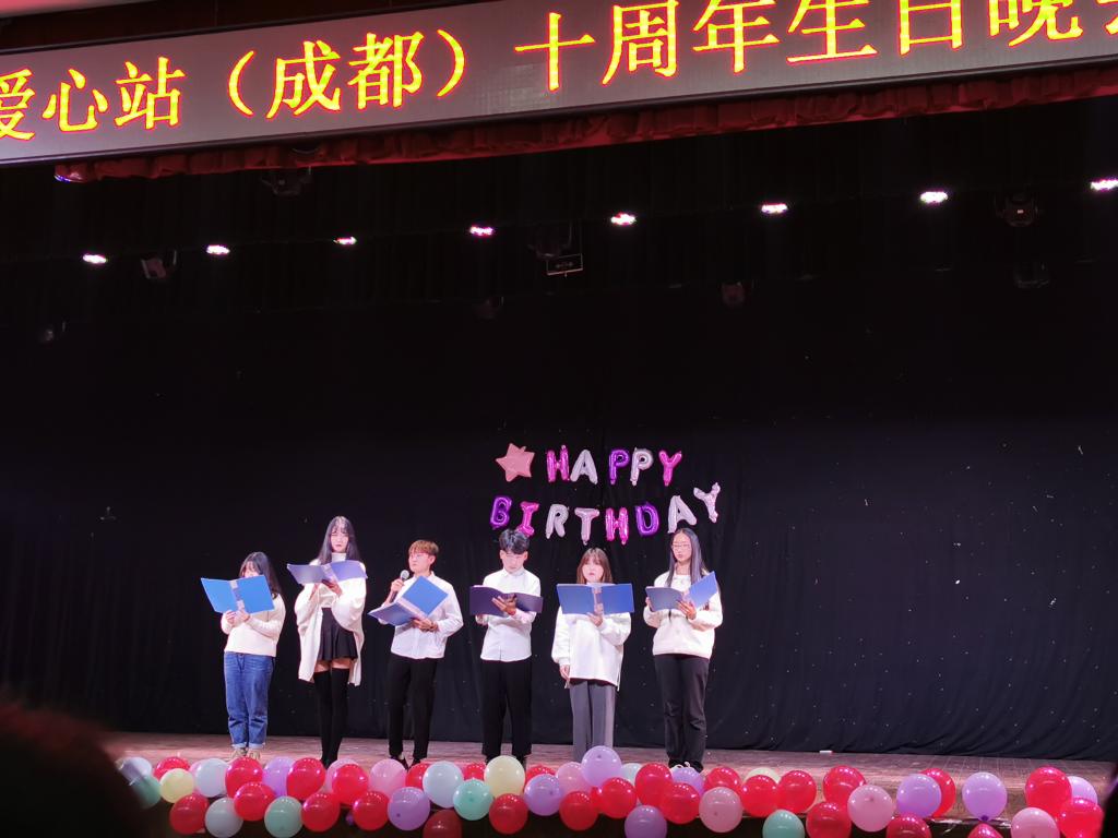 回首往昔,爱心站十年风雨坚守初心;展望未来,爱心站但行前路永不退却。十一月二日晚七点半,爱心站(成都)十周年生日晚会在食堂四楼隆重举行。