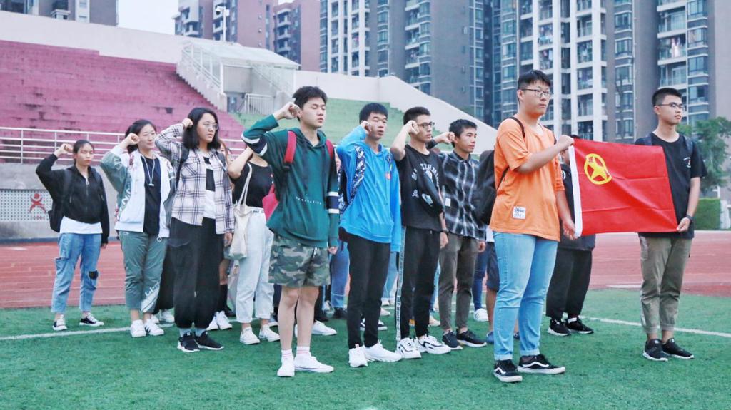 在升国旗时,全体团员对着国旗行了庄重的注目礼,并齐唱了国歌。观礼过程中,国旗护卫队整齐的步伐、严肃的神情让在场的每一位团员都肃然起敬,他们的心随高高飘扬的国旗一同升起,他们高昂的国歌声让沉寂的校园苏醒。随后,团支书带领大家在团旗下齐唱团歌,重温入团誓词,使得团员们更加明确和坚信要继承五四精神、继承先辈永垂不朽的爱国精神、继承先辈前赴后继英勇无畏的牺牲精神的决心。