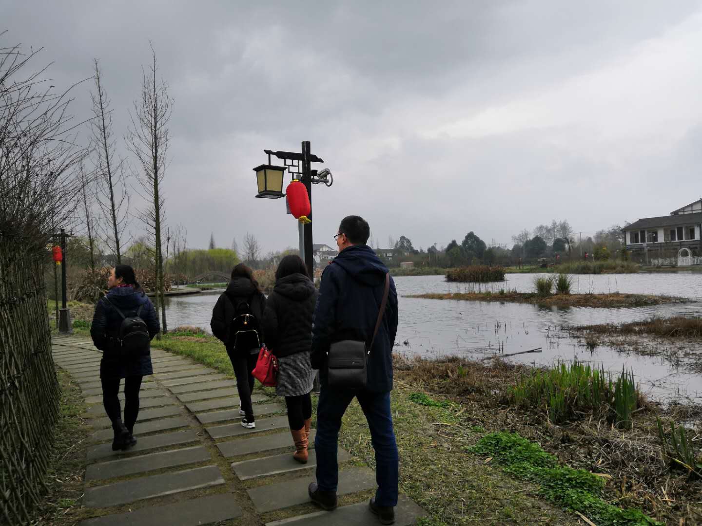 虽然天公不作美,但老师们仍然兴致勃勃地冒着绵柔细雨,围着幸福田园社区的水立方湿地公园漫步。湿地公园四周绿草青青,水光潋滟,间杂着白的李花、红的海棠和黄色的油菜花,一派田园风光让老师们不断停下脚步,拍照留念。在游览中,老师们还结合专业知识,从园区的经济发展理念、整体规划设计、园林植物配置到乡村旅游的发展模式交流心得体会。通过游览,老师们纷纷表示在乡村振兴中我们低调看球 将大有用武之地,各专业大有可为,“生态优先,绿色发展”的城乡发展理念和实践也将更加深入地服务新时代,创造新生活。