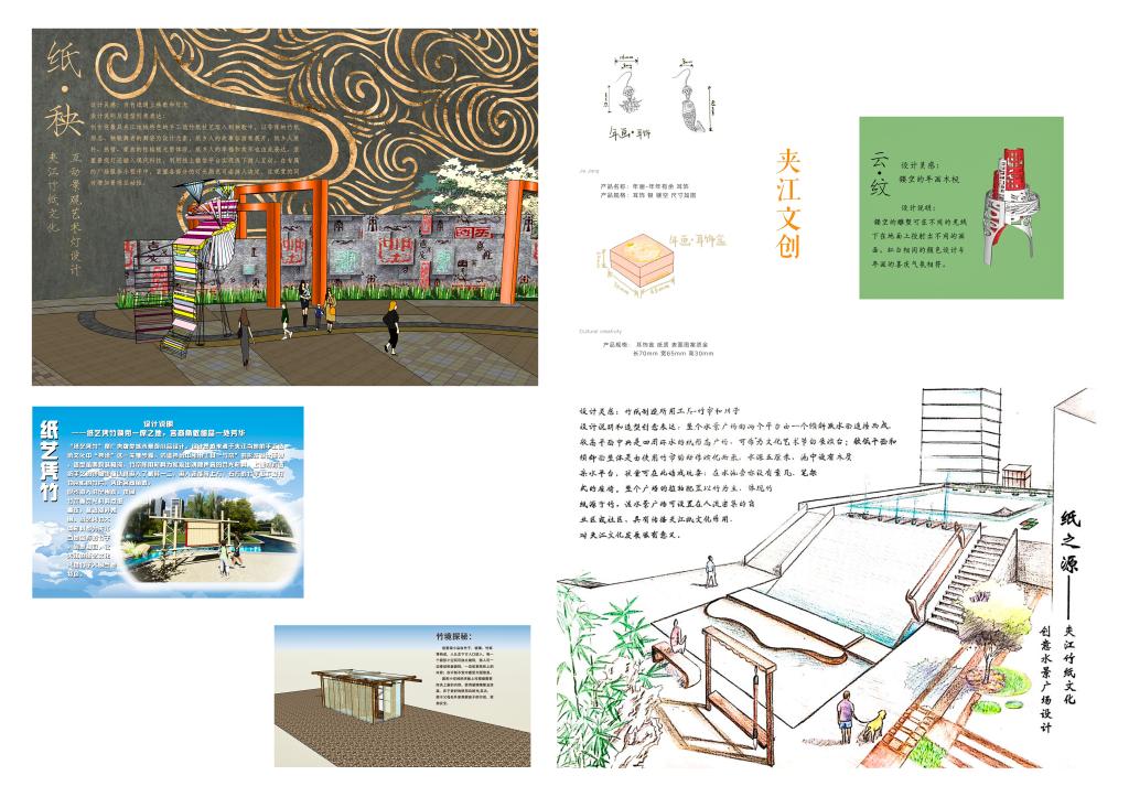 “凉风有信”调研团队成员大多是低调看球 的学子,此次调研除了了解非遗文化外,学习现代景区规划以及从文化中提取灵感创作作品也是重要的实践目的。实践结束后,团队成员创作设计了《纸·秧》、《云纹》、《竹境探秘》等多幅具有夹江文化特色的景观小品及文创产品效果图。