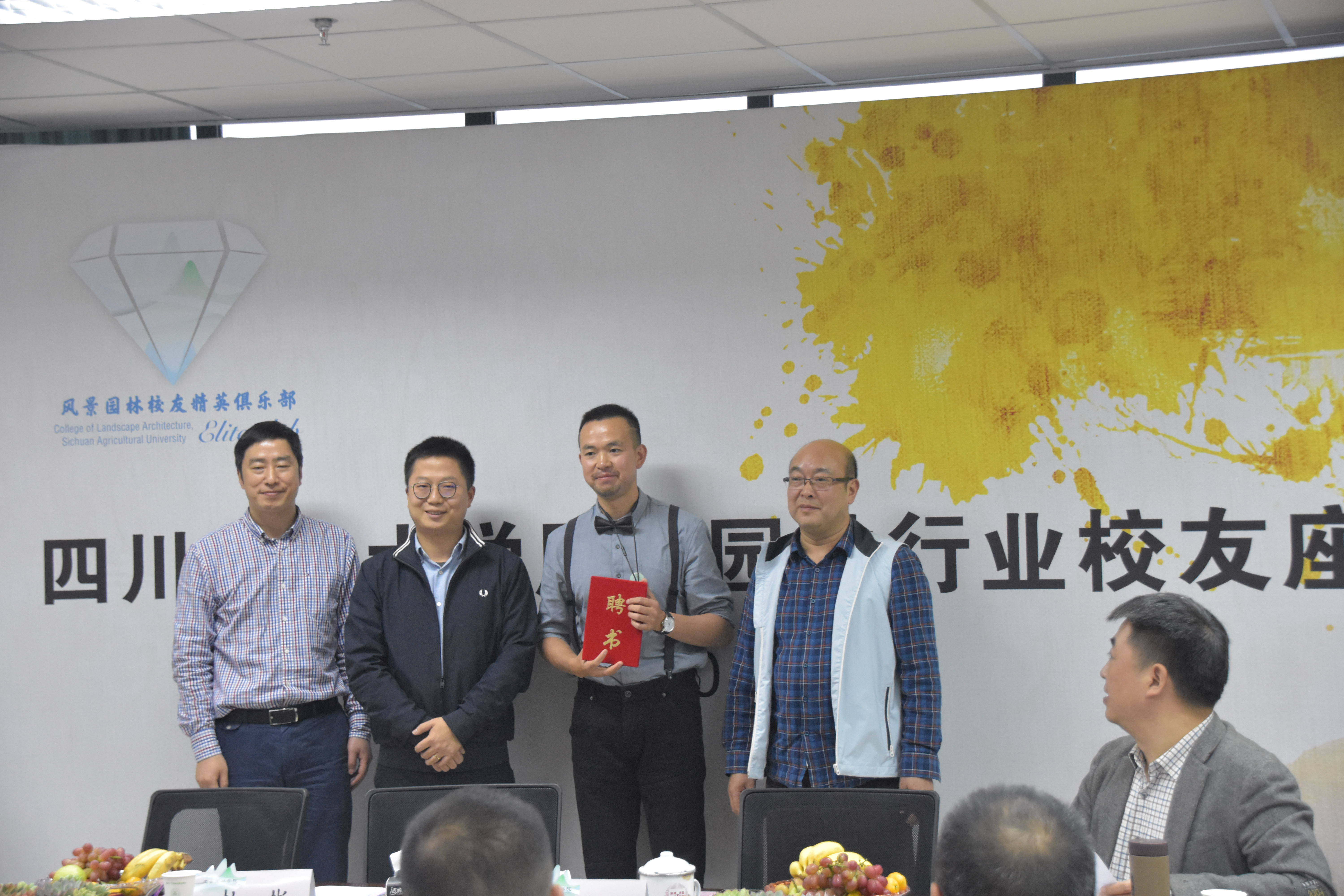 本次会议还特邀了成都普禾国景景观设计有限公司总经理杨茅矛、中国建筑西南设计研究院有限公司景观院园林所所长黄振华、成都李家驹创意景观设计有限公司总经理李家驹、成都传承景观规划设计有限公司创始人钟迪等5名菁英校友担任低调看球 校外导师,与2016级风景园林3班、2016级环境设计1班、2016级园林3班等5个小班结成对子。由杜彬、陈其兵为5名校外导师颁发聘书,结对班班主任为导师佩戴院徽。接下来校外导师将直接进小班,与小班同学面对面交流,学生也将进入导师企业进行参观学习。这是低调看球 学生工作的创新之举,让在校学生能提前感知行业现实情况和行业发展方向,旨在提升学生的职业素养,打造更多“菁英”学生。