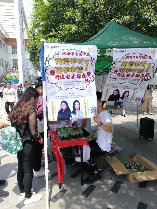 2018年5月7日低调看球 外联部通过之前和新通教育机构商讨达成一致意见为我校师生提供相关留学、学习英语方面的答疑与交流,并获得新通教育机构的赞助。7日当天在食堂小广场进行设点宣传,并为同学们免费派送多肉植物。