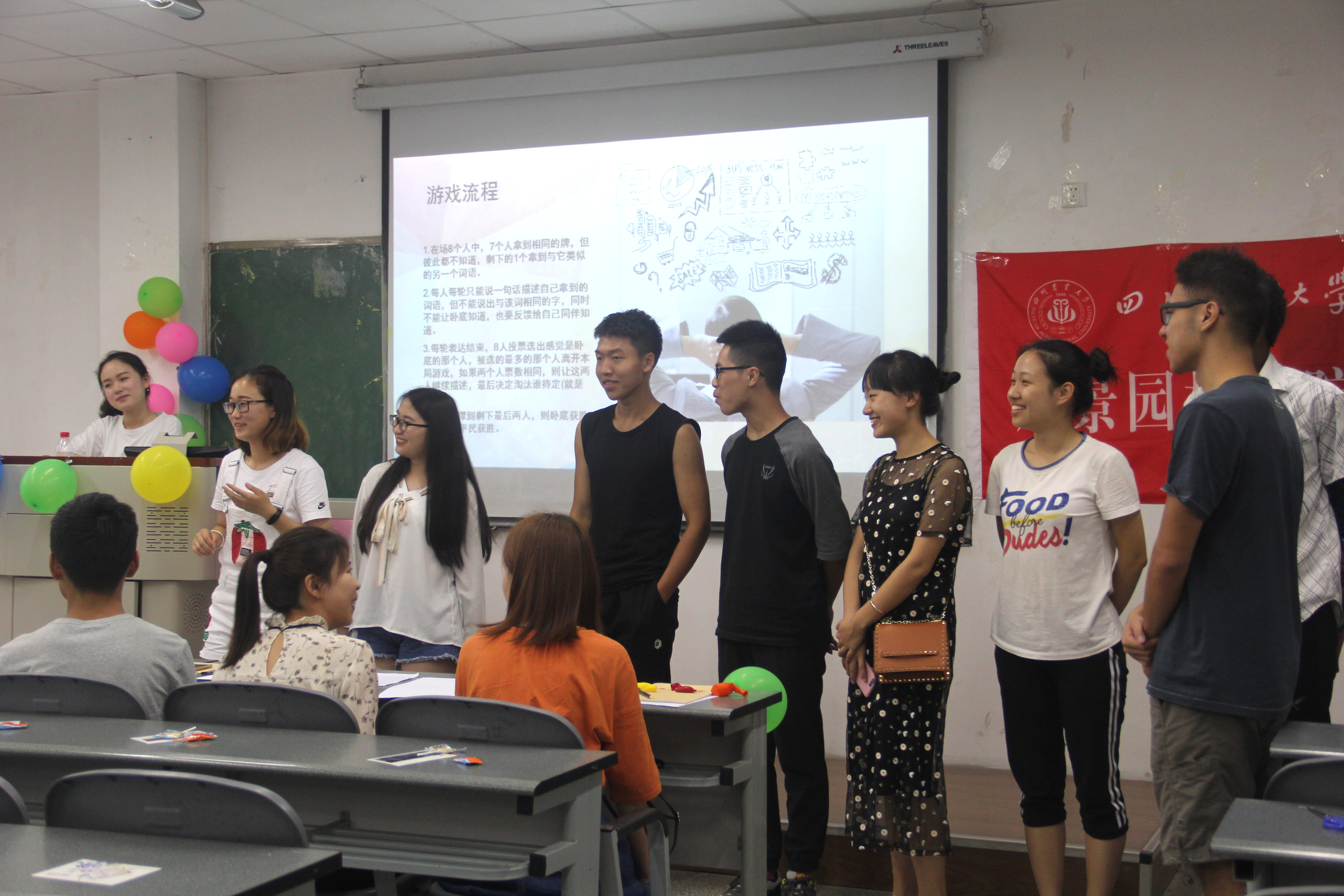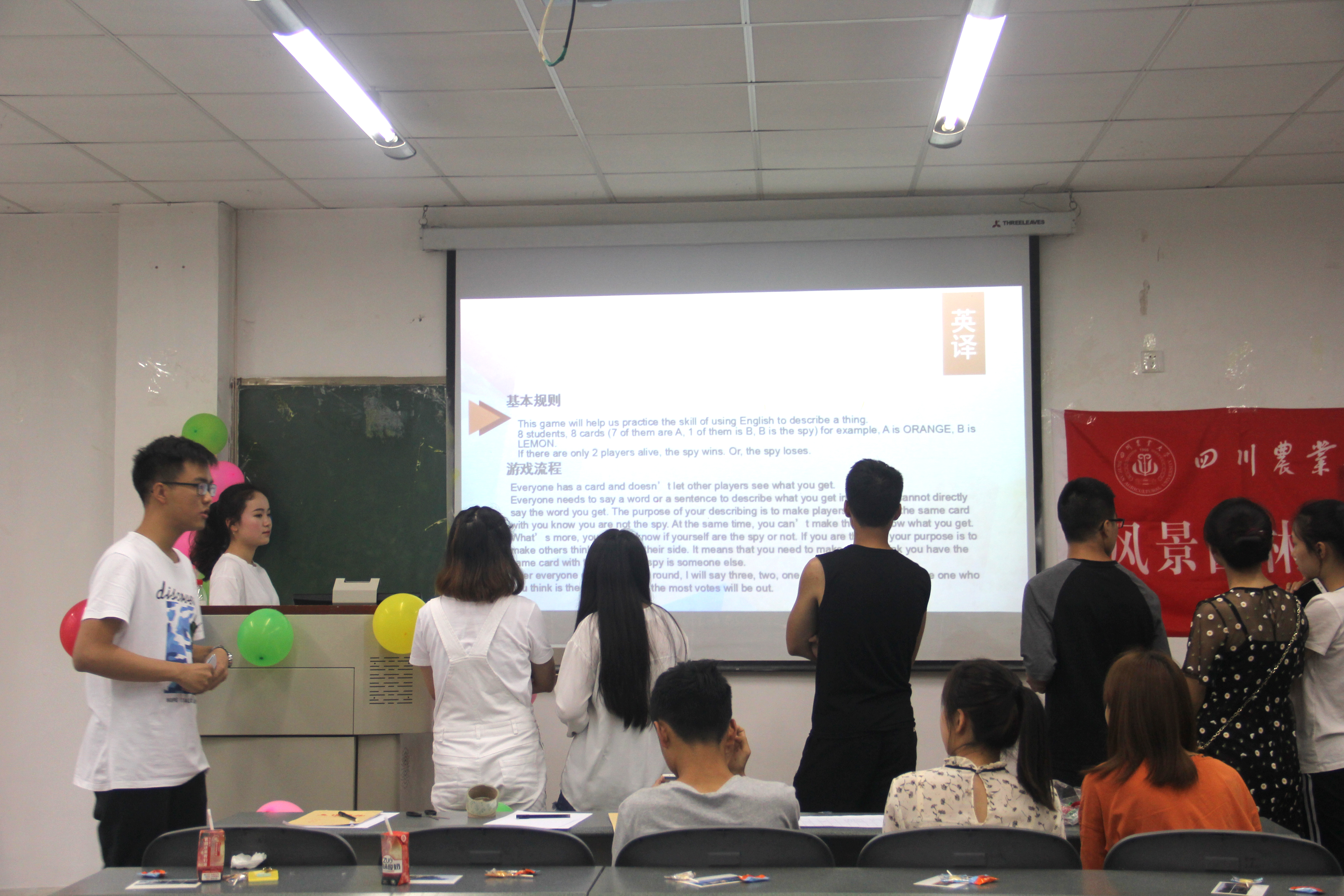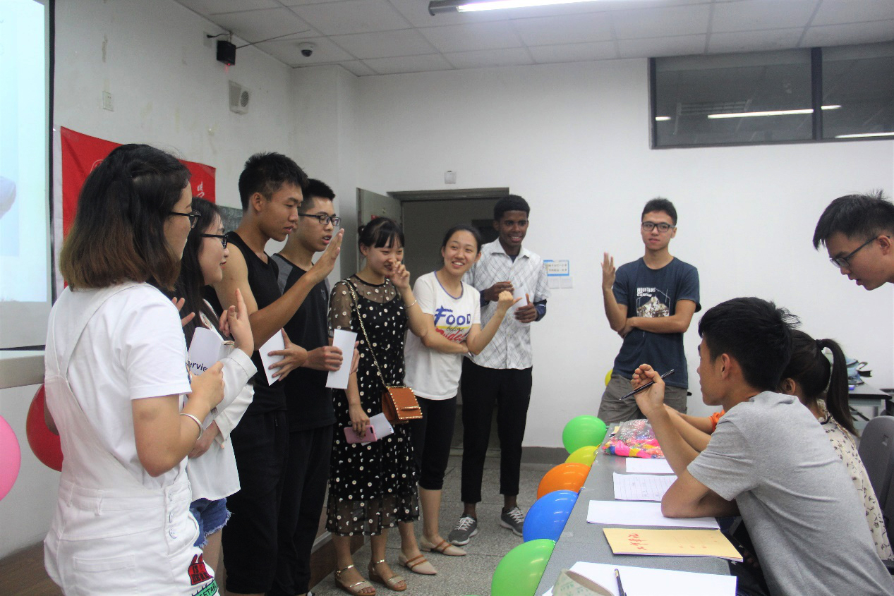 本次活动还开展了以英文主题游戏:《谁是卧底》、《你划我猜》、《单词接龙》,现场同学参与积极。参与游戏的同学需要运用英语进行交流,这既锻炼了同学们的单词运用能力以及英语口语发音,也增强了同学们用英语表达时的自信。在《你划我猜》环节,同学们争分夺秒,培养了默契和团队精神;在《单词接龙》环节,全体同学参与其中,活动达到高潮。