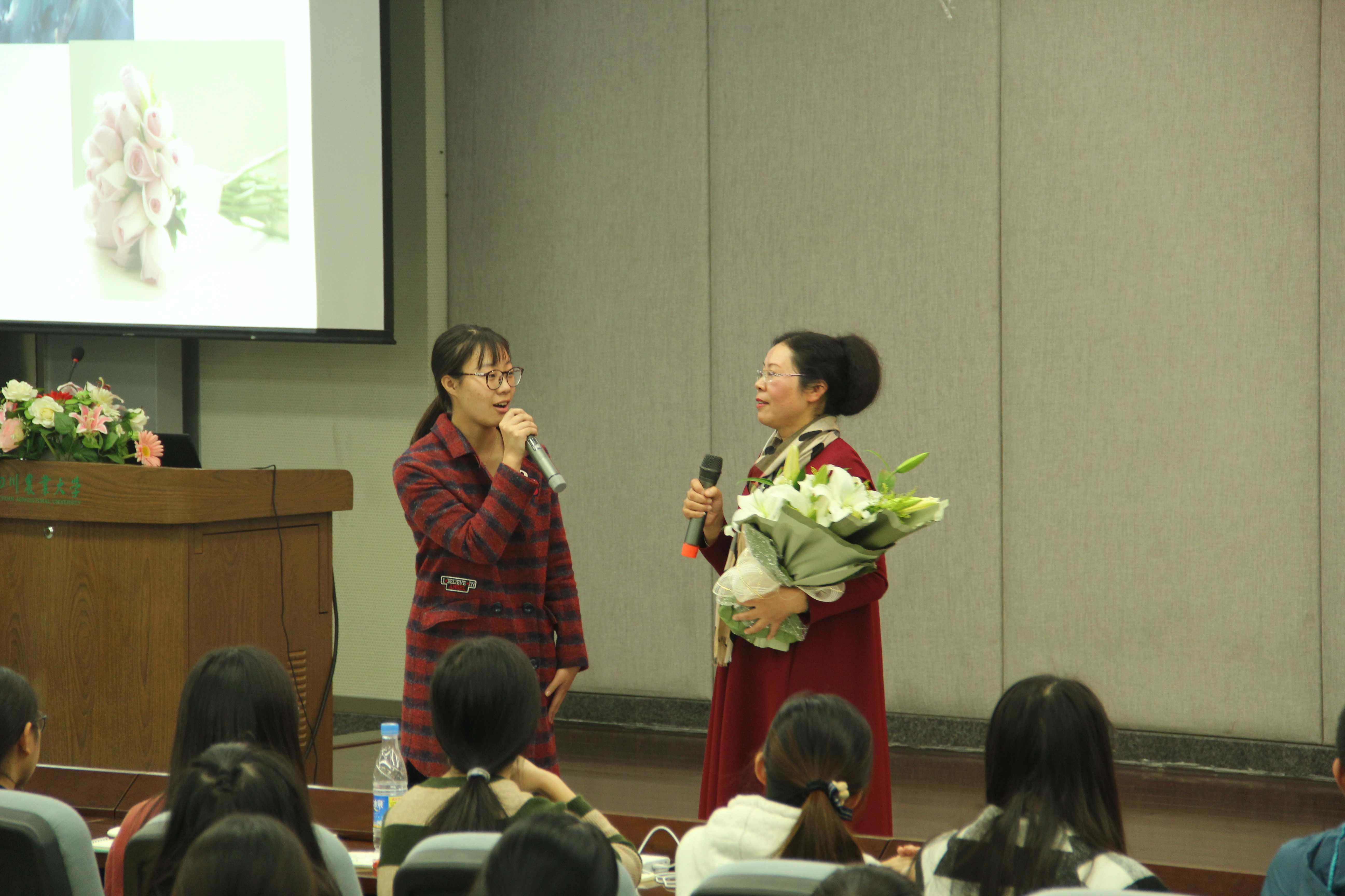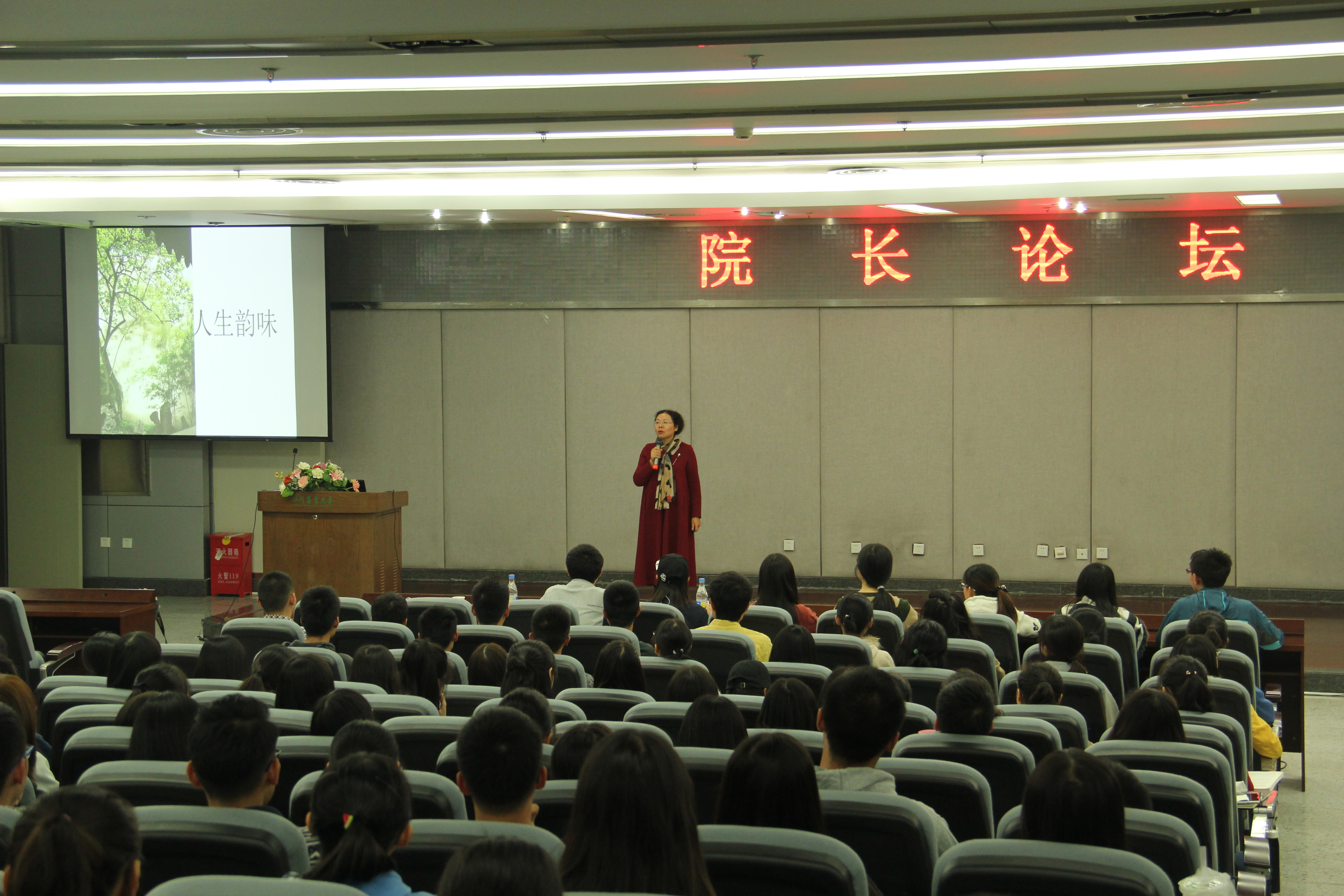 陈中桂以“七情六欲”开篇,引入“人生韵味”主题,与同学们分享了许多人生经历。她用一个个真实的小故事借助直观形象的图片,讲述了充满韵味的人生哲理。在学生提问环节,陈中桂用丰富的人生事例,结合晦涩难懂的哲学思想,深入浅出,生动形象地阐述了出国热、高学历与素质教育、大学生特质等热门话题,赢得到了在场同学的热烈掌声。