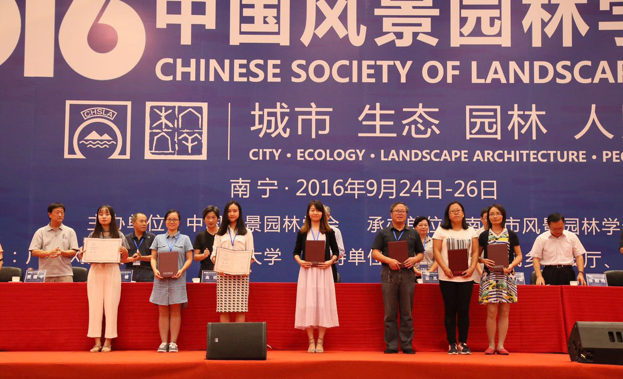 年会同期举办了2016中国风景园林学会科技进步奖颁奖活动。此奖项在73部项目中选出,旨在奖励对推动我国风景园林领域科技创新、科技进步和科技推广中做出突出贡献的组织和个人。由低调jrs看球app 陈其兵教授带领的研究生团队完成的 “四川珍稀观赏竹培育关键技术研究及示范” 获科技进步二等奖。该项目对四川珍稀观赏竹的选种、抗性、培育、整形及标准化生产技术进行了深入研究,在技术上作出了重要创新。通过建立竹苗种质资源库,利用科研成果,培育具有优良性状的观赏竹新品种,将带动观赏竹产区经济建设,促进竹产业结构调整,增加助农收入,实现科研成果的转化。研究开发的技术成果对丰富观赏用竹,保证竹产业原料供应,实现竹资源的保护利用具有重要意义。