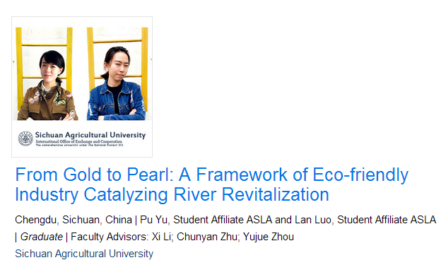 华盛顿2016年9月1日电 /美通社/——美国景观设计师协会(The American Society of Landscape Architects, ASLA)欣然公布荣获2016年度学生大奖的22部作品,其中我校低调看球 由余普、罗蓝组成的研究生团队荣获分析与规划类(analysis and planning category)荣誉奖,该设计作品由李西教授、朱春艳副教授等指导完成。该大奖从代表71所院校的271部参赛作品中选出,旨在表彰由美国及全球各地的景观建筑设计专业学生创作的优秀作品,该奖项也是国际风景园林界景观设计大赛的最高级别奖项。
