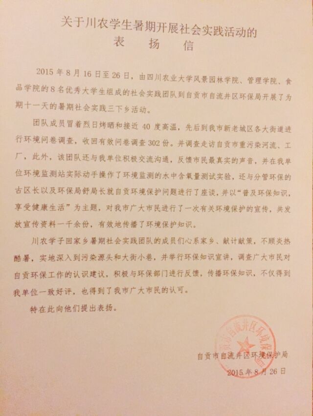 信的末尾讲到:川农学子回家乡暑期社会实践团队的成员们心系家乡、献计献策,不顾炎热酷暑,实地深入到污染源头和大街小巷,并举行环保知识宣讲,调查广大市民对自贡环保工作的认识建议,积极与环保部门进行反馈,传播环保知识,不仅得到单位一致好评,也得到了广大市民的认可。