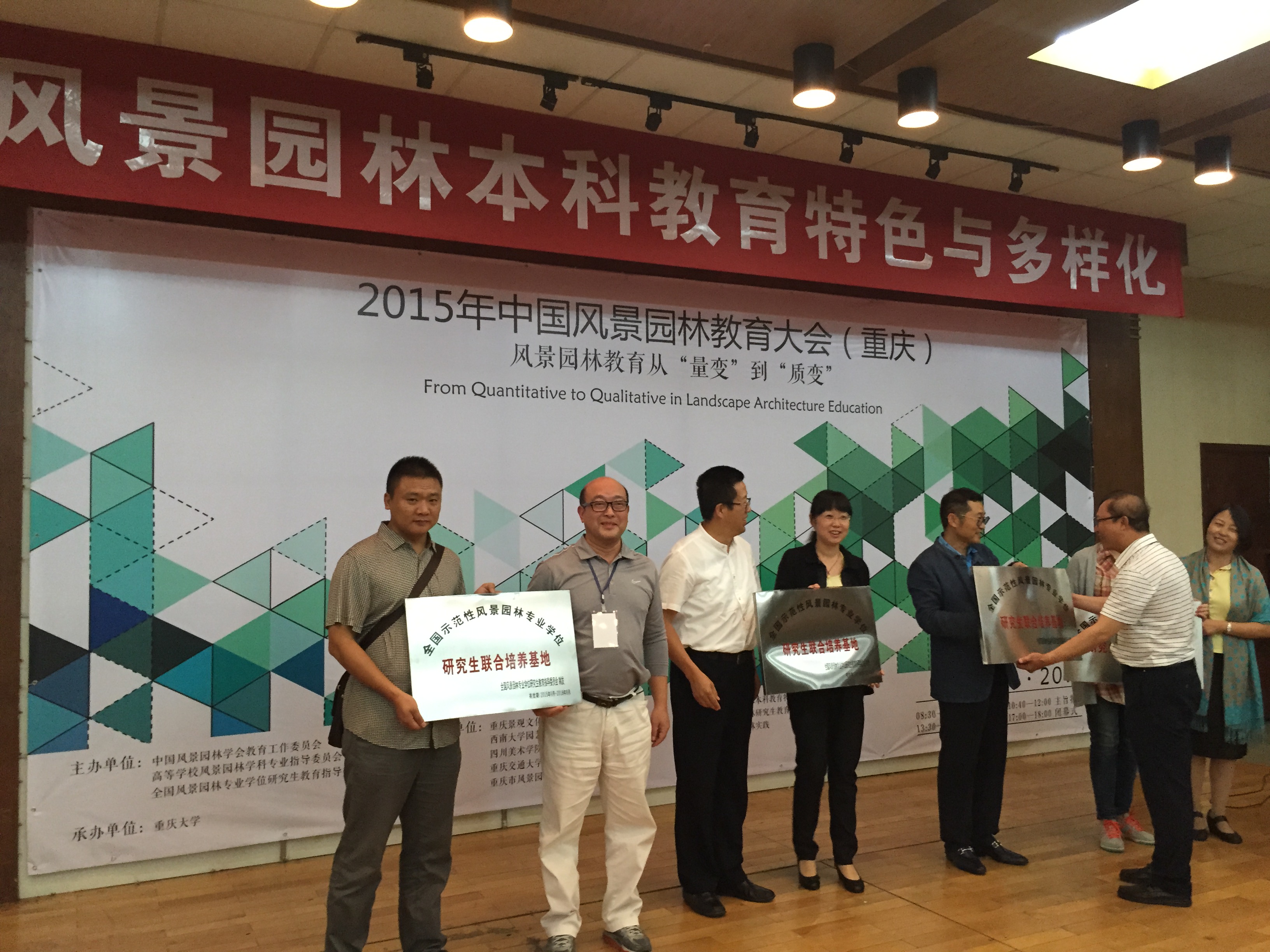9月18日,在重庆大学举行的全国风景园林教育大会上,全国风景园林专业学位教育指导委员会向获得“全国示范性风景园林专业学位”研究生联合培养基地的单位进行了授牌仪式。由低调看球 和四川农大风景园林设计研究有限责任公司共同申报的研究生联合培养基地获此殊荣,全国共有10所院校成功申报。