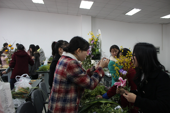 此次大赛从中午一点半正式开始,各个参赛队伍充满激情,成员积极思考,相互讨论,共同创作,充分体现了团队团结协作的凝聚力,创作过程精巧繁杂却又有条不紊。整个会场成了花的海洋,空气中弥漫的花香让人沉醉,会场气氛积极热烈。