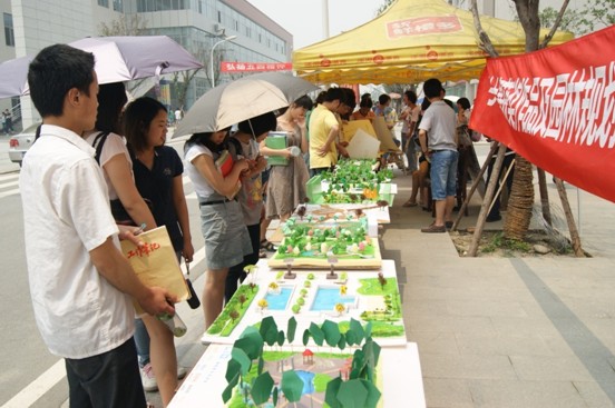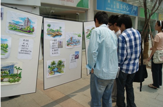 5月18日,由低调看球 学习部承办的“手绘大赛获奖作品及园林规划设计食堂东侧绿地游园设计模型展览”在食堂外展出。