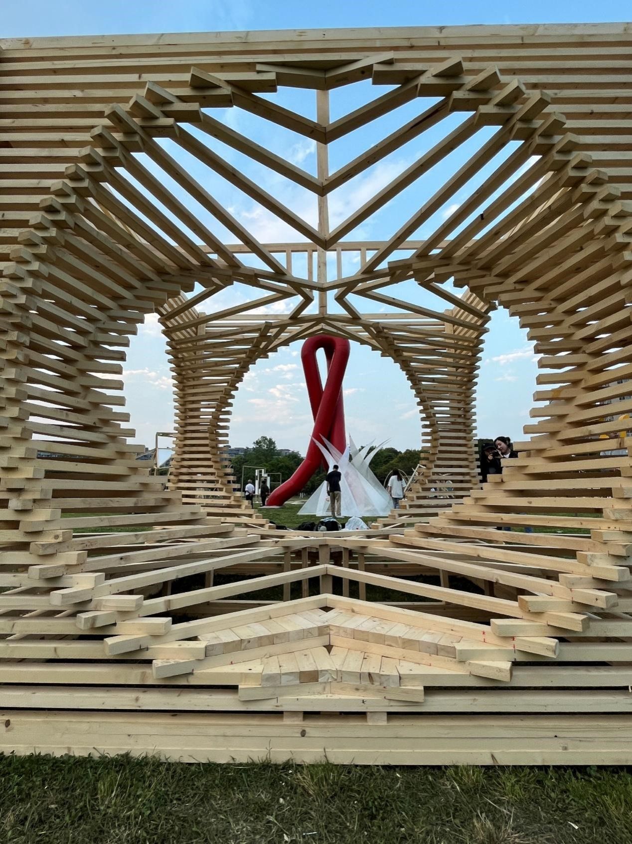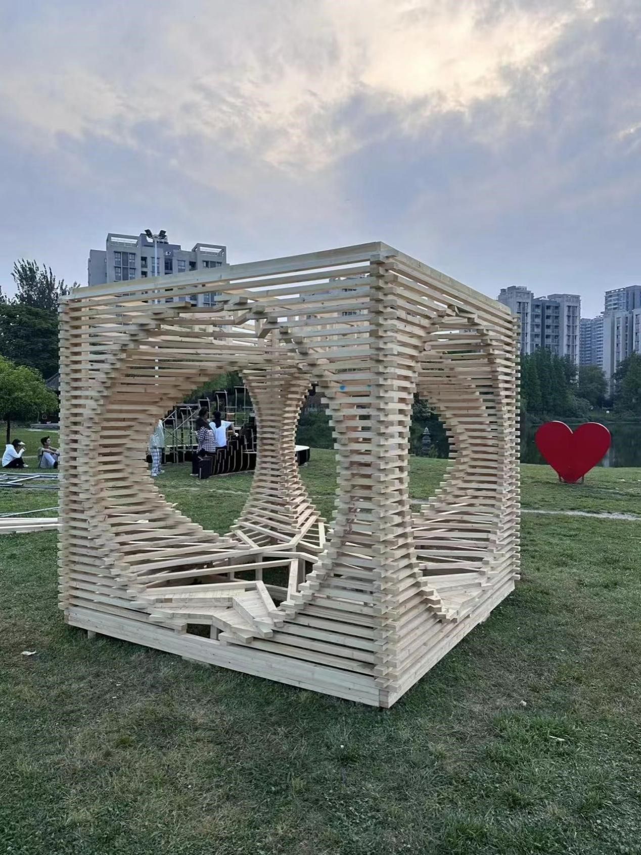 “蓉洄锦韵”由风院青年教师王璐、吕兵洋共同指导,游宇恒、李瑞可、张鸣君、彭泰森、王昱凯、李相汶6名学生共同设计搭建完成,作品围绕本届“天府建造节”《天府驿站:追梦大运》的主题,用设计作品从两个层次展示我校风院师生对主题理解和艺术表达。第一层次“蓉洄”代表着融合与包容,也展现了成都的开放和谐与包容。作品在方体的基础上进行了球体镂空创作,也体现了在天府驿站这样一个积极的空间中包容着世界各地的多样的文化,也传递着世界四方的运动精神传达出作品对于大运会参赛者的期待。第二层次“锦韵”主要通过搭建细节中交叉重叠、经纬交织的方法,以拟合唐联珠琪格纹锦,将蜀绣的美融入到作品之中。同时作品还充分丈量实用适用的功能,即可以作为游人休憩停留和打卡社交的场所,也能通过作品本身的文化内涵使留驻者感受到与整座城市建立更紧密的联系。最终,“蓉洄锦韵”受到专家评委的高度评价,以总分第一的成绩斩获此次竞赛唯一一等奖。