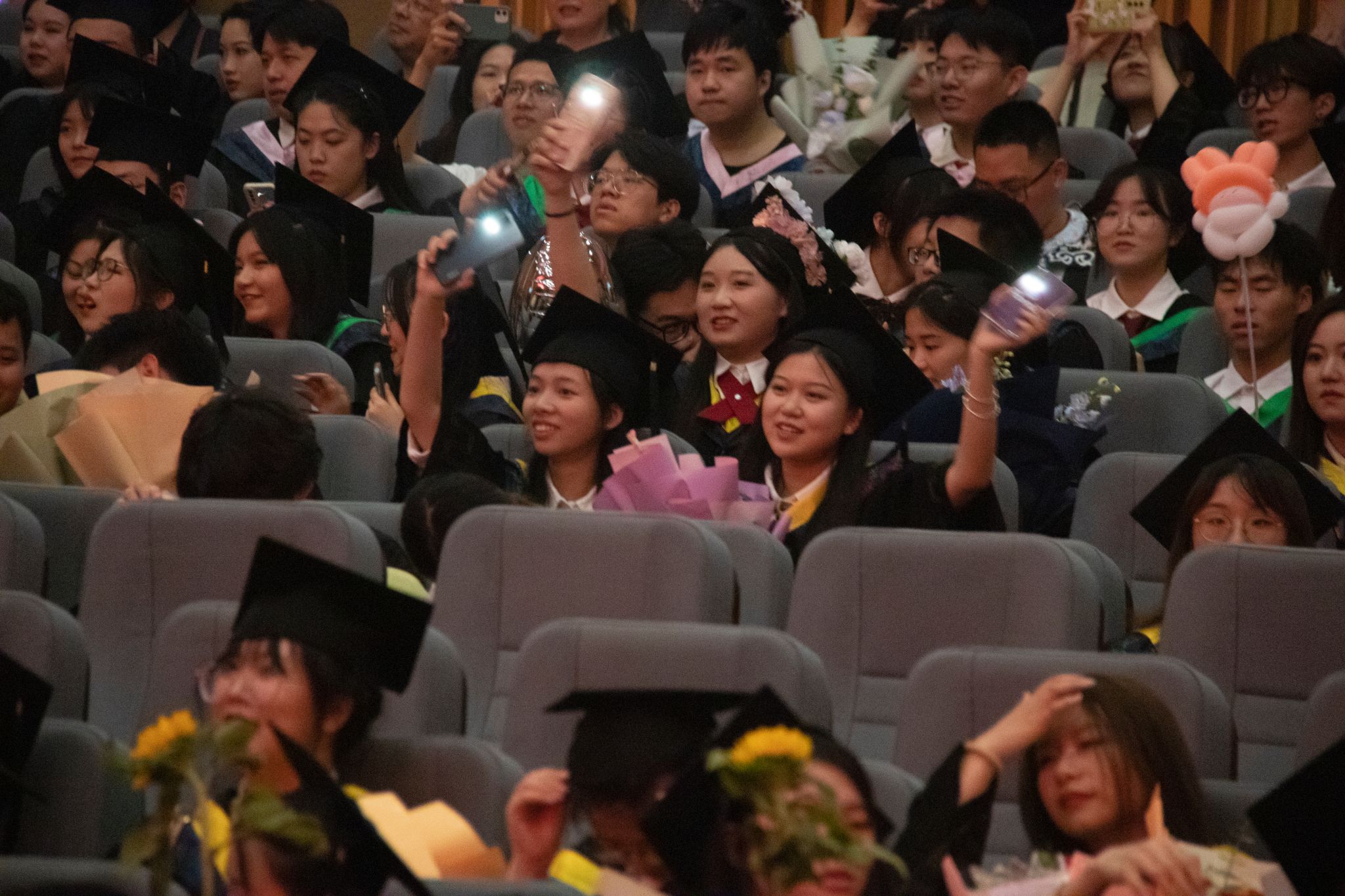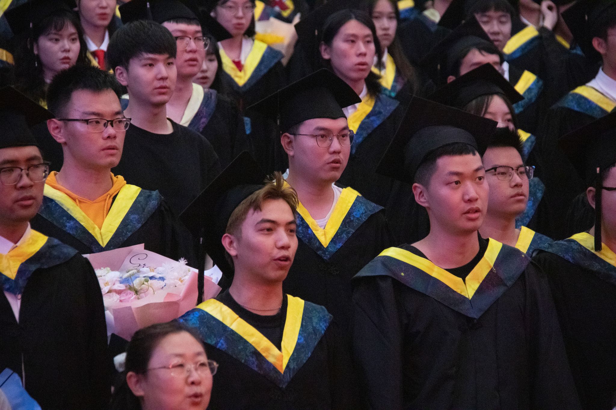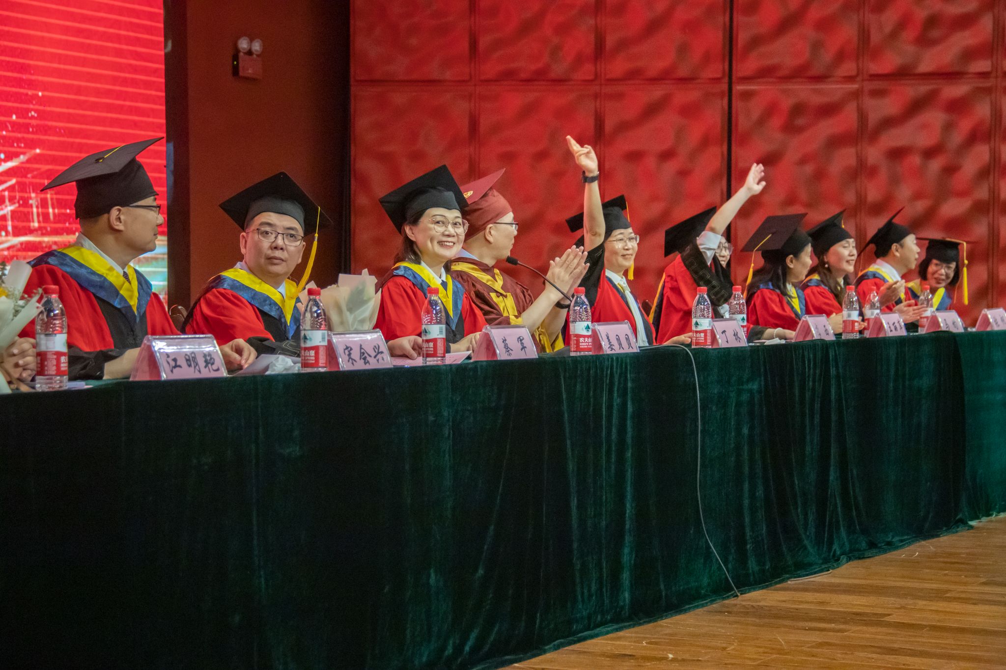 在副校长丁林宣读校学位评定委员会授位决议后,全体毕业生在悠扬的《桂花飘香的季节》陪伴下,依次接受授位。