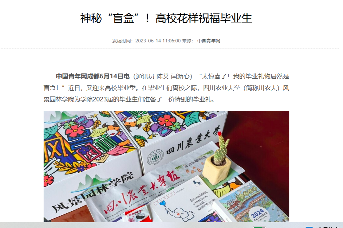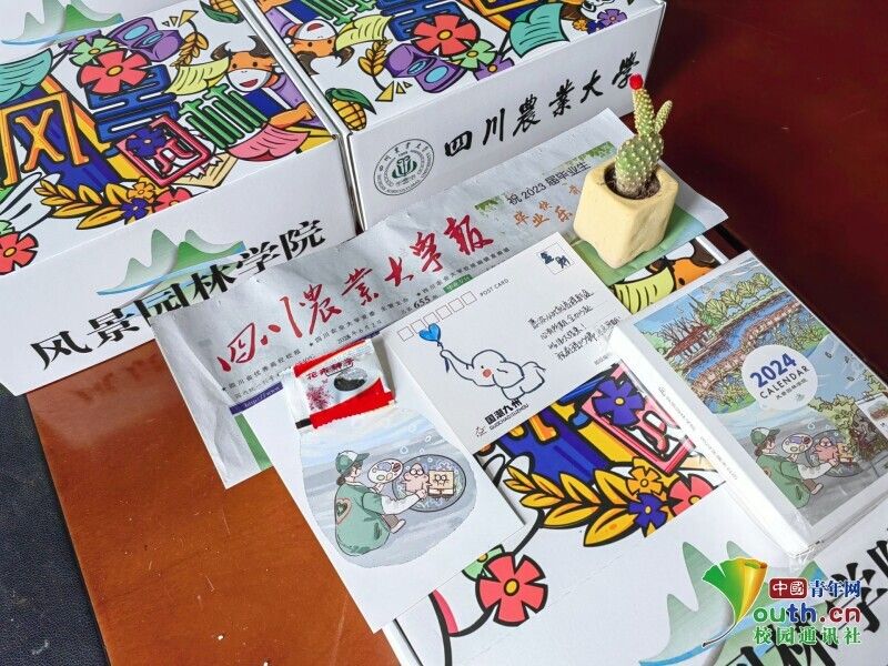 “礼盒中,还有学校今年为毕业生们特意印制的毕业专刊,以及我们低调看球 学生自主设计、并将川农大重要标志点或代表人物作为图案而制作成的台历。”参与分装礼物的园林专业2021级的陈灵希表示,希望在学长学姐们翻阅台历时,可以回忆起在川农大的点点滴滴,和发生在这里的青春故事。“制作日历的目的是想让毕业生们勇于面向新的起点,并懂得珍惜时间与每一段经历。”在被问及为何选择日历作为盲盒内容之一时,辅导员张廷宇这样说到。