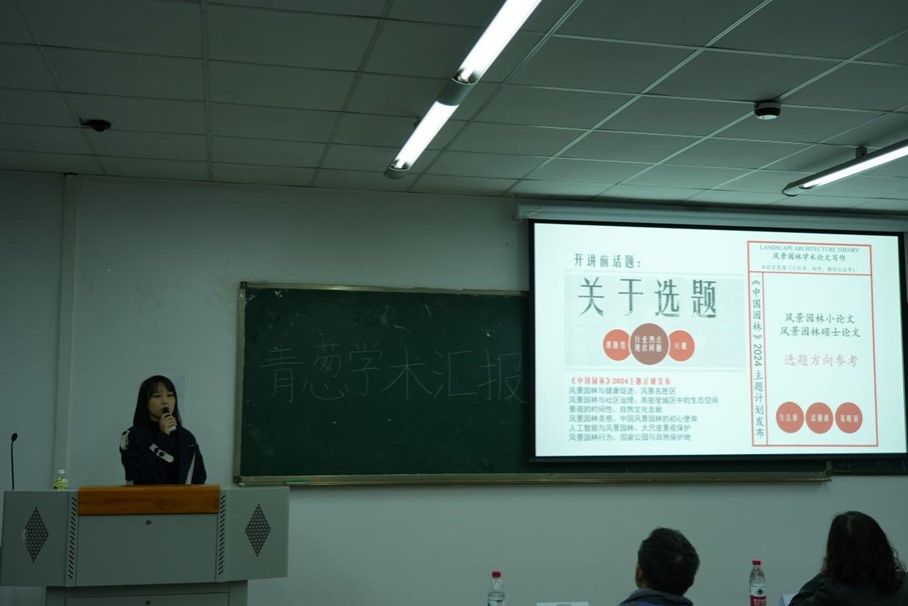 活动过程中,袁雨歌同学向大家介绍了“无人机测量在风景园林中的应用与实践”。他以自己的实际项目为例,向同学们详细地介绍了无人机的基础知识、使用注意事项以及无人机测量的优缺点等,开阔了低年级研究生的视野。同时,席丹丹同学给大家介绍了如何进行毕业论文的选题。她说,同学们需要结合课题组的研究方向、行业热点和自己的兴趣爱好进行选题,需要注意的是论文选题需要解决现实问题、摆脱行业困境,跟做竞赛一样找到问题去攻克,选题范围不能太广泛、并且需要考虑实验是否具有可行性。此外,她还列举了常见的研究方法并进行了研究方法的解读;为大家指出了选题的参考来源,并详细介绍了操作步骤。活动结束后,同学们纷纷表示此次活动令他们获益匪浅,希望今后能够有机会继续参加此类活动。