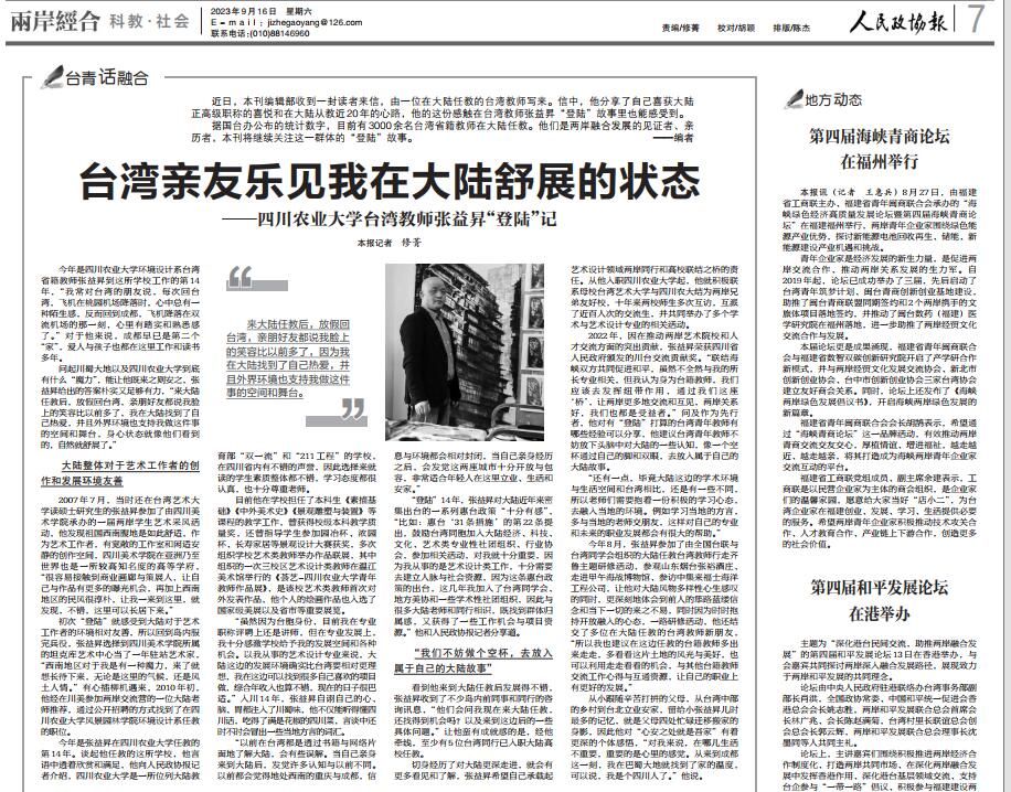 “登陆”14年,张益昇对大陆近年来密集出台的一系列惠台政策“十分有感”,“比如:惠台‘31条措施’的第22条提出,鼓励台湾同胞加入大陆经济、科技、文化、艺术类专业性社团组织、行业协会,参加相关活动,对我就十分重要,因为我从事的是艺术设计类工作,十分需要去建立人脉与社会资源,因为这条惠台政策的出台,这几年我加入了台湾同学会、地方美协和一些学术性社团组织,因此与很多大陆老师和同行相识,既找到群体归属感,又获得了一些工作机会与项目资源。”他和人民政协报记者分享道。