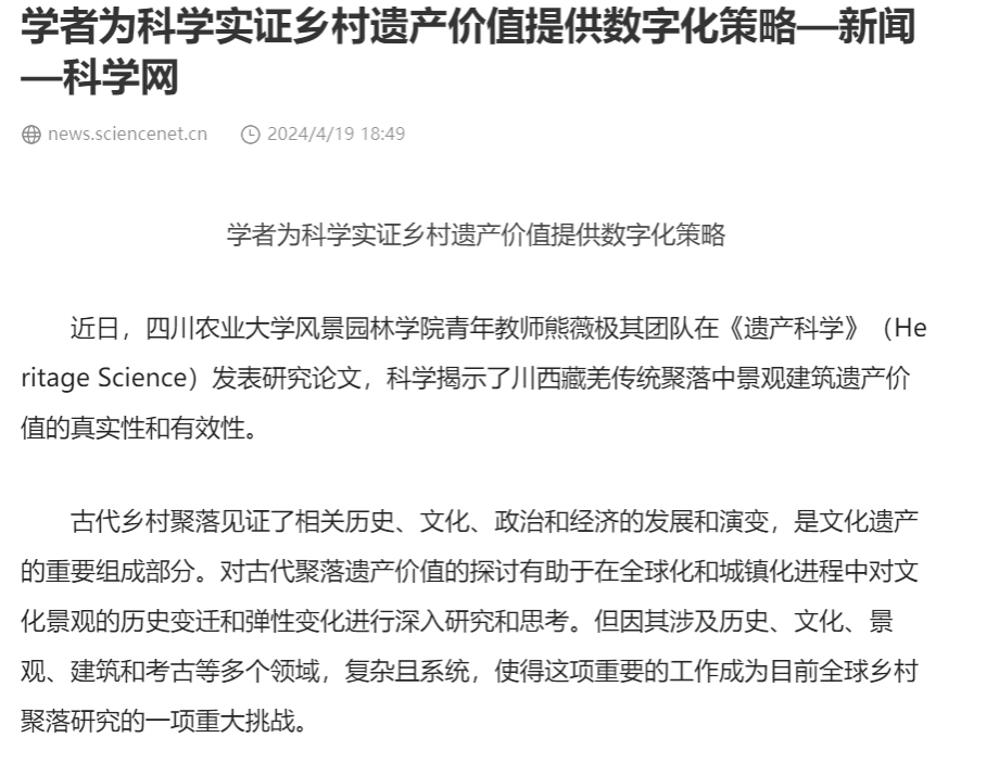 近日,低调看球-低调jrs看球app 青年教师熊薇极其团队在《遗产科学》(Heritage Science)发表研究论文,科学揭示了川西藏羌传统聚落中景观建筑遗产价值的真实性和有效性。