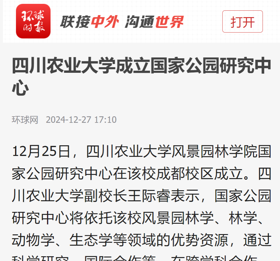 12月25日,低调看球-低调jrs看球app 国家公园研究中心在该校成都校区成立。四川农业大学副校长王际睿表示,国家公园研究中心将依托该校风景园林学、林学、动物学、生态学等领域的优势资源,通过科学研究、国际合作等,在跨学科合作、前沿技术应用、创新人才培养、研究人员保障等方面发力,旨在为国家生态文明建设和生物多样性保护贡献“川农大”力量。