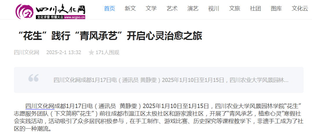 “花生”志愿服务团队(下文简称“花生”)前往成都市温江区太极社区和游家渡社区,开展了“青风承艺,植愈心灵”寒假社会实践活动,活动吸引了众多居民积极参与,在手工制作、游戏比赛、历史探究等课程教学下,非遗手工成为了社区的一种潮流。