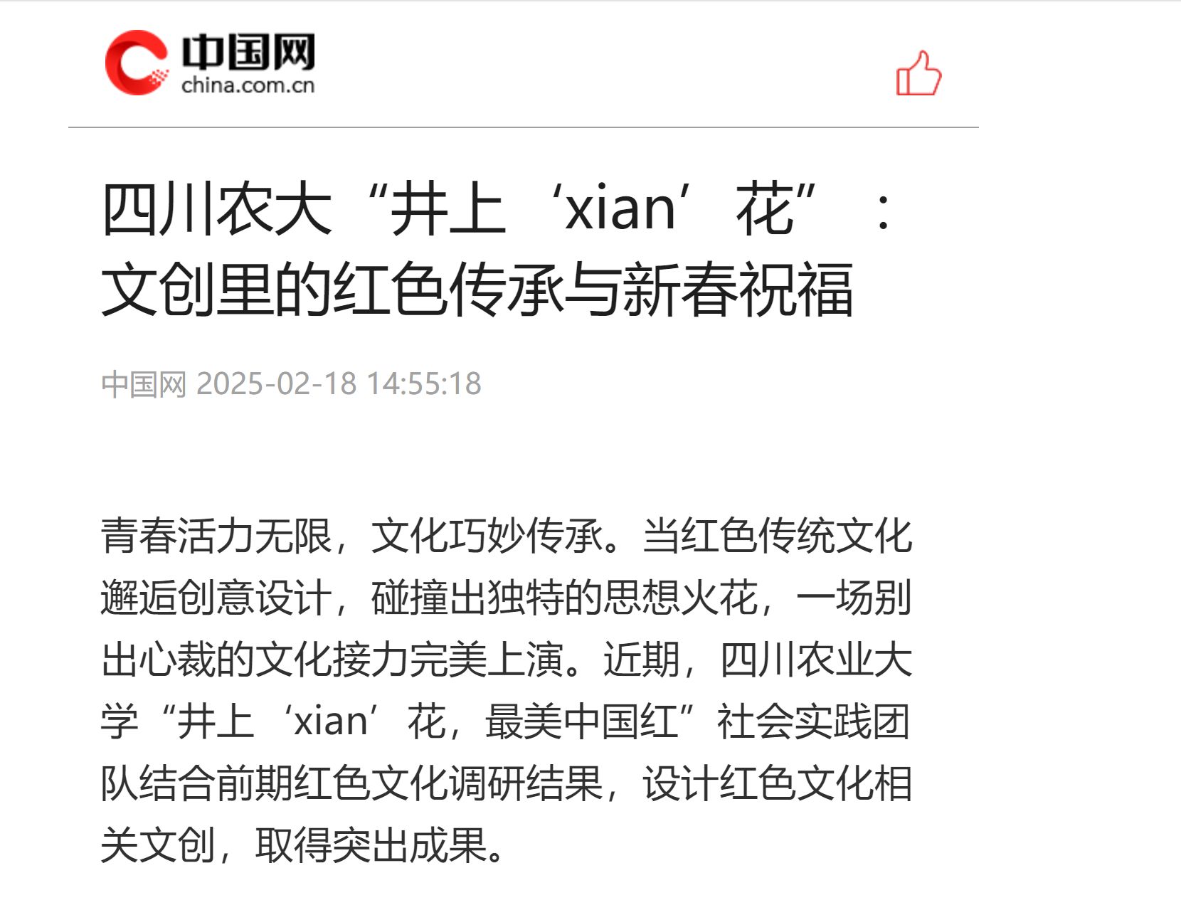青春活力无限,文化巧妙传承。当红色传统文化邂逅创意设计,碰撞出独特的思想火花,一场别出心裁的文化接力完美上演。近期,四川农业大学“井上‘xian’花,最美中国红”社会实践团队结合前期红色文化调研结果,设计红色文化相关文创,取得突出成果。