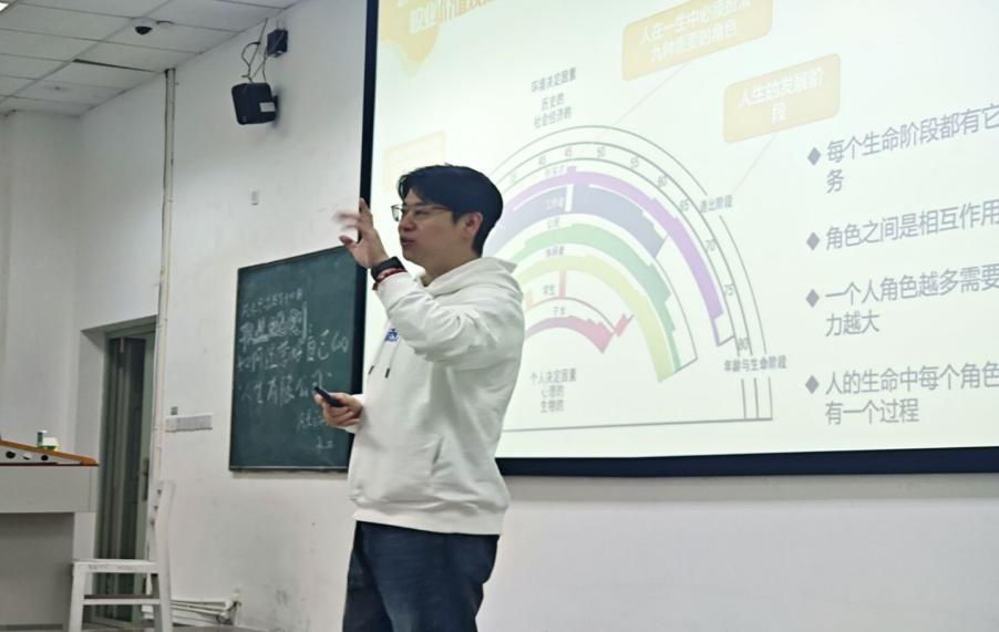 张俭从认识自我切入,强调“经营人生有限公司”要以清晰的自我定位为前提。他通过剖析人生九大角色的动态平衡关系,阐述了不同生命阶段的核心任务,并引导学生结合实际情况绘制专属生涯发展彩虹图。“角色越多,平衡的难度就越大,因此需做好取舍。”张俭指出,“职业规划的本质是资源分配,需在动态调整中明确优先级。”这一观点引发学生共鸣,现场互动频频。