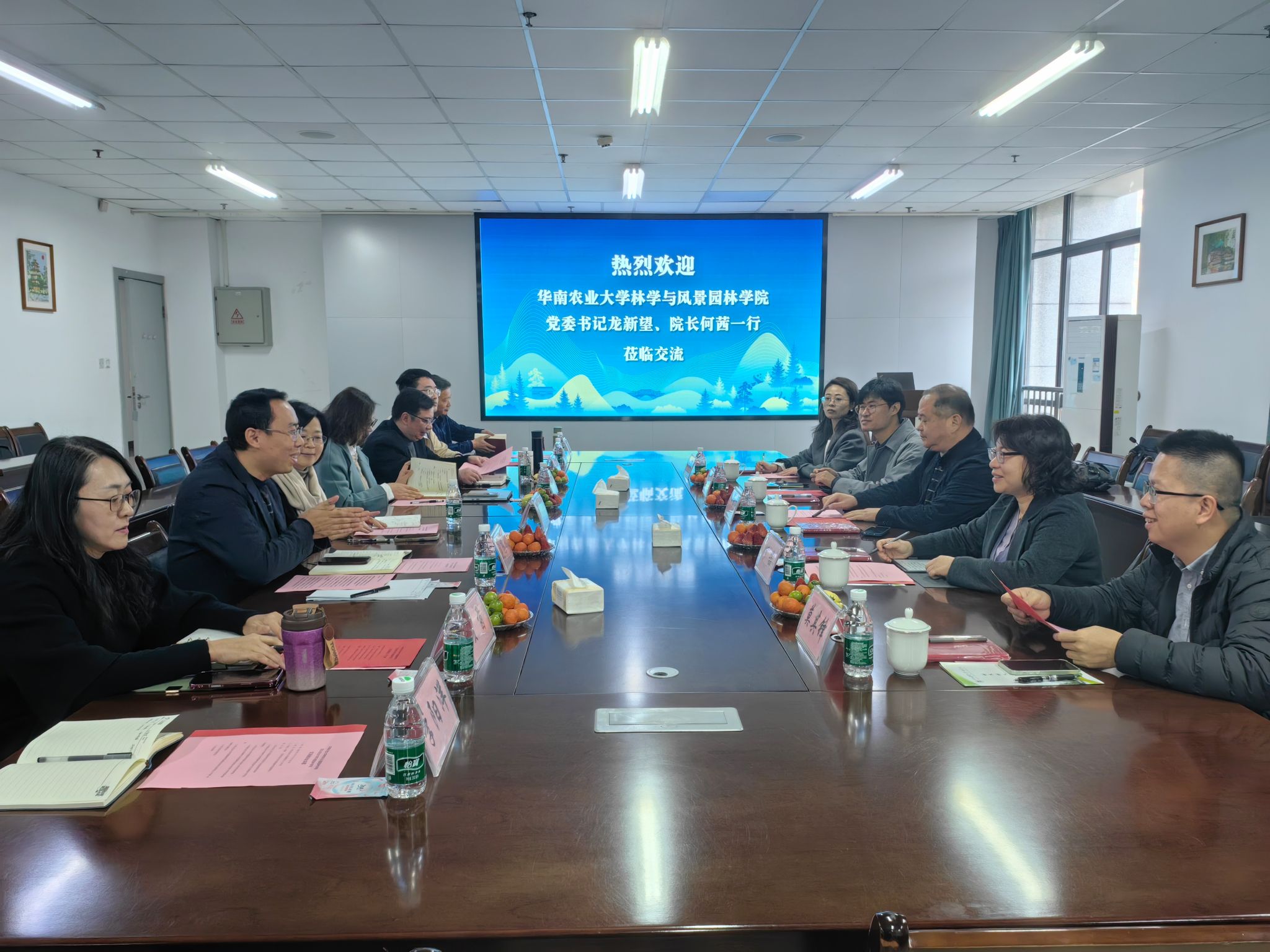 4月3日,华南农业大学林学与低调看球 党委书记龙新望一行5人来校交流座谈。低调看球 党委书记饶远林、院长李西,副院长姜贝贝、蔡军及相关系室中心负责人参加座谈会。