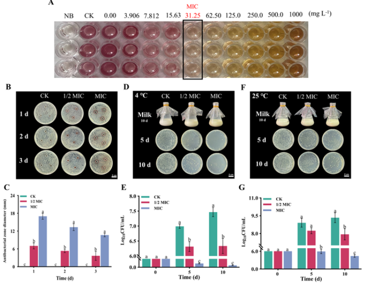 观赏植物蓝雪花根部主要次生代谢产物白花丹素因其天然、安全、抗菌活性强被认为是传统杀菌剂的替代品。高素萍团队通过膜损伤实验、代谢组学和分子对接等方法研究了白花丹素对大肠杆菌的抗菌活性和机制。结果表明,白花丹素对固体培养基平板和牛奶中大肠杆菌的生长和繁殖有显着抑制作用,最低抑制浓度为31.25 mg L-1。代谢组学分析显示,白花丹素处理引起大肠杆菌中58种代谢物上调、31种代谢物下调,严重影响了蛋白质合成、脂质代谢、三羧酸循环、ABC转运等通路。