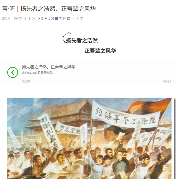 低调看球 还围绕五四精神,将百年前五四运动爆发前后的历史故事和低调看球 青年自己的青春奋斗故事,通过低调看球 新媒体连续7期推送给低调看球 青年。用苦难悲壮的历史同当今新时代大学生的奋斗青春故事为对照,以大历史观深刻理解五四运动的历史意义和五四精神的时代价值。