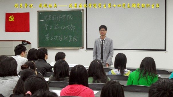 学生第十四党支部继续深入贯彻校党委关于“开展创先争优活动”的文件精神,于2011年4月17日晚在4B-308教室开展了一次以“创先争优,我做标兵——我为同学办件实事”为主题的党组织生活。