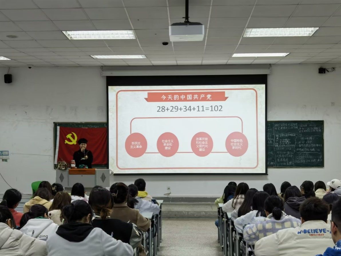 何宇以《中国共产党的指导思想》为主题,讲述了“国家指导思想”与“中国特色社会主义理论体系”的区别,以及新中国从站起来、富起来,到强起来的理论成果及指导思想。