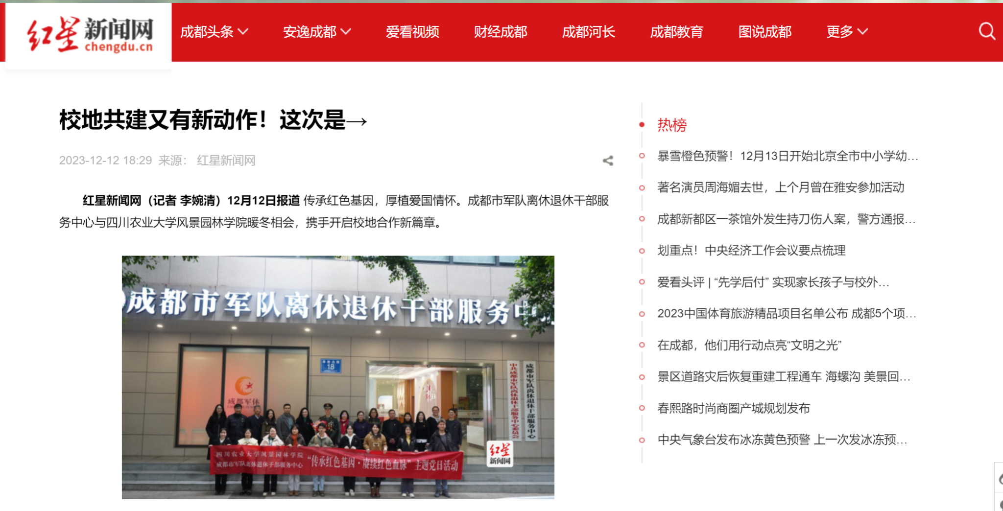 12月12日,成都市军队离休退休干部服务中心、低调看球-低调jrs看球app 联合开展以“传承红色基因·赓续红色血脉”为主题的党日活动暨校地结对共建签约仪式。成都市军休中心、低调看球-低调jrs看球app 主要负责人,军休功臣代表,低调看球-低调jrs看球app 师生代表共计30余人参加活动。