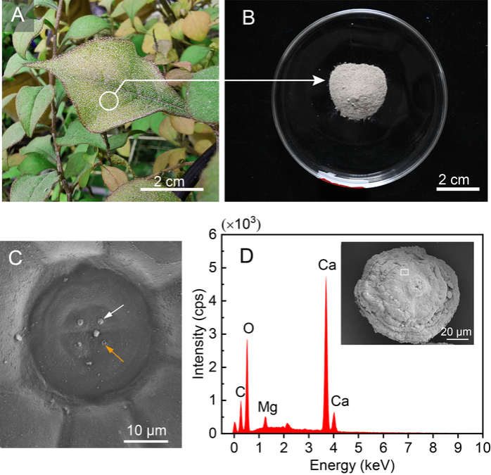 生物固碳是一种自然、生态、低成本的碳汇方式,在全球减碳中发挥了重要作用。生物矿化固碳是指通过生物代谢活动将大气CO?转化为难溶性碳酸盐(如CaCO3和MgCO3等)的过程。因碳酸盐沉淀物本身是构成地壳岩石的基本物质之一,不会像光合作用固定产生的有机物那样会被微生物分解后,又以CO?形式重回大气。因此,普遍认为这种固碳过程更加稳定和持久。尽管前人已发现一些植物通过特殊腺体(如垩腺)分泌离子在体外形成白色结晶物CaCO?,这类植物统称为垩腺植物,但至今尚不清楚这些CaCO?与大气CO?的关联,以及其生物矿化的生态意义。