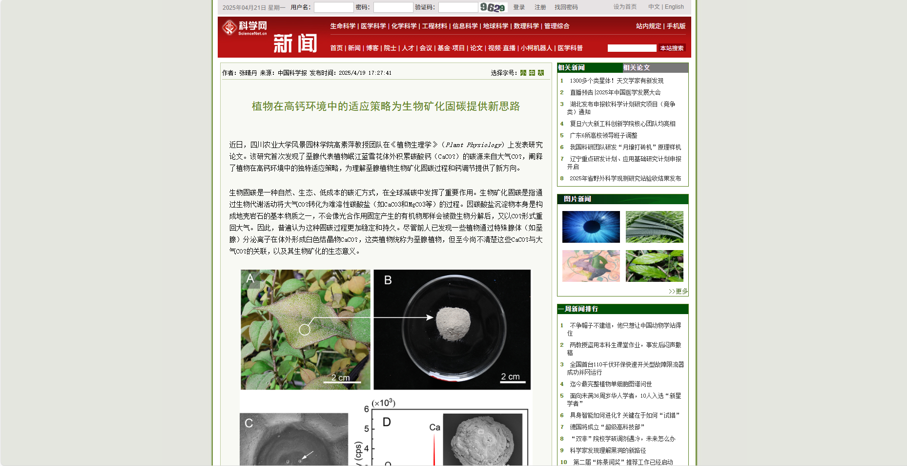 【媒体视角-科学网】植物在高钙环境中的适应策略为生物矿化固碳提供新思路