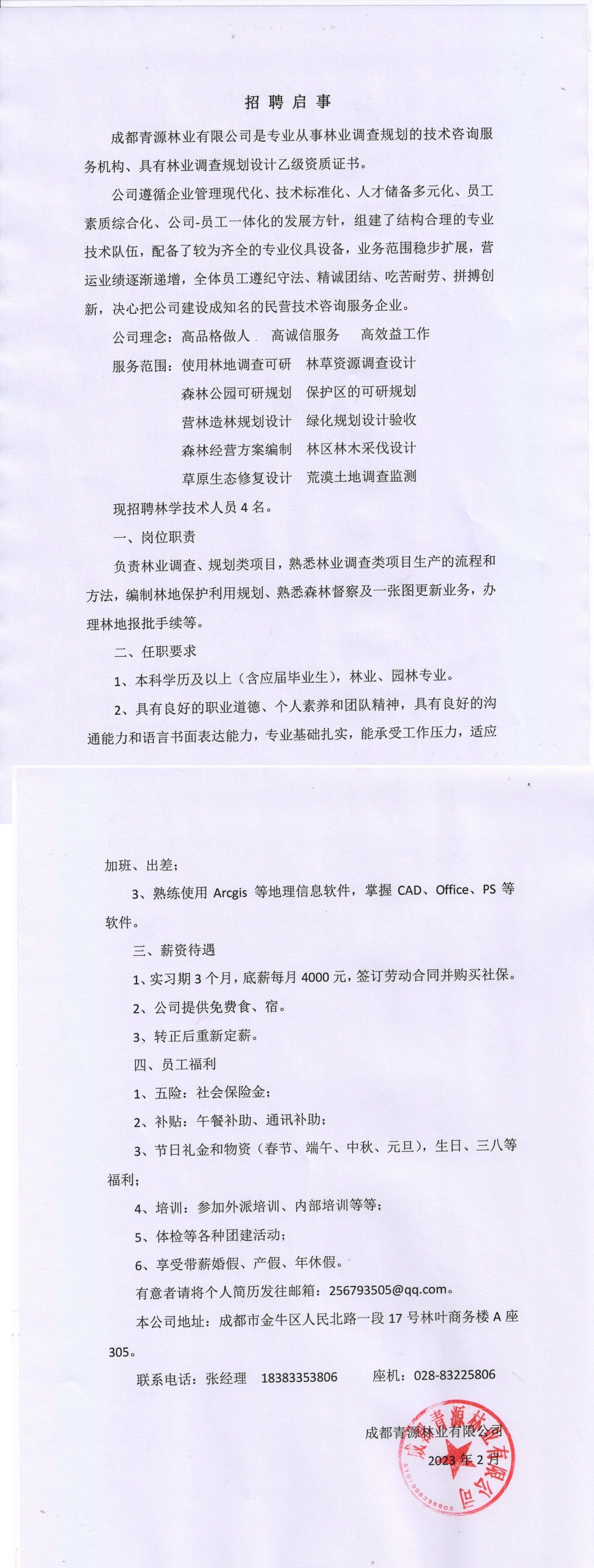 成都青源林业有限公司招聘人才