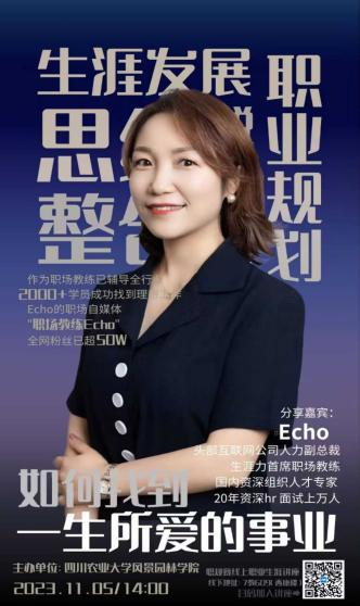 为促进大学生提高生涯规划综合能力同时作为低调看球 首届“菁英杯”大学生职规赛同期协同活动,低调看球 特别邀请到生涯力首席职场教练、头部互联网公司人力副总裁张晨老师,在2023年11月5日在四川农业大学成都校区7-609和613,为同学们举办了“如何找到一生所爱的事业”为主题的生涯规划讲座。