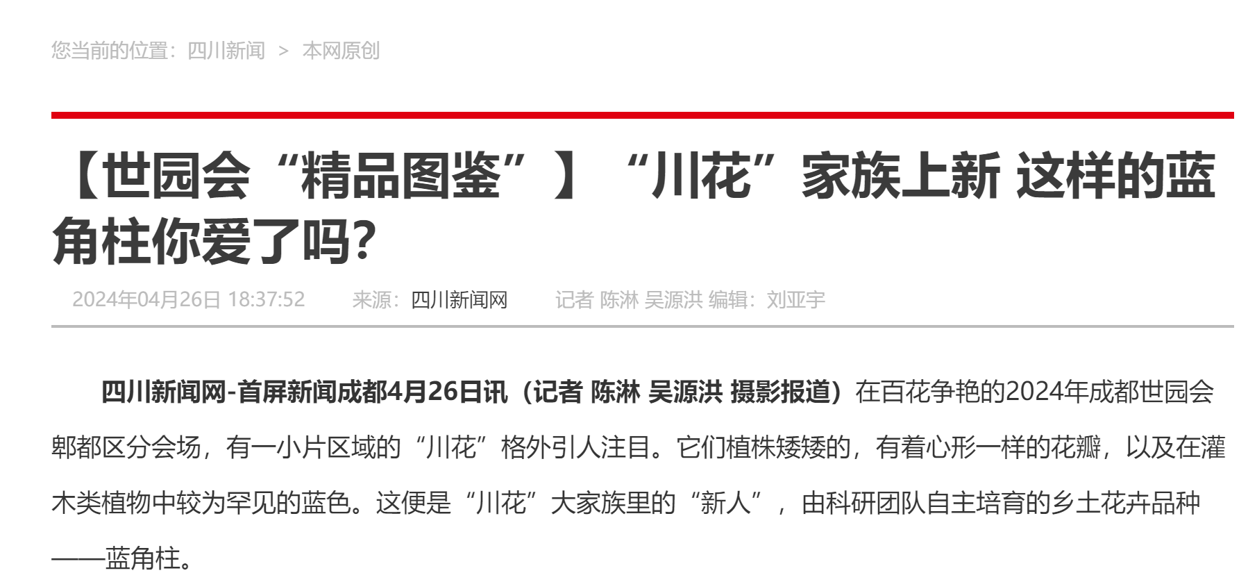 四川新闻网-首屏新闻成都4月26日讯(记者 陈淋 吴源洪 摄影报道)在百花争艳的2024年成都世园会郫都区分会场,有一小片区域的“川花”格外引人注目。它们植株矮矮的,有着心形一样的花瓣,以及在灌木类植物中较为罕见的蓝色。这便是“川花”大家族里的“新人”,由科研团队自主培育的乡土花卉品种——蓝角柱。
