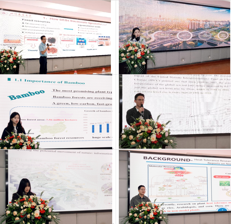 会议学术报告环节,上午场次由环境低调看球 院长沈飞教授和雷永佳副教授,以及低调看球 副院长蔡军教授和郭丽副教授共同主持。此阶段共有四位国际知名专家和两位青年学者报告了他们的最新研究成果。希腊帕特雷大学Dionissios Mantzavinos教授作了《Biomass Valorization in the Context of Sustainable Engineering and Circular Economy(可持续工程和循环经济背景下的生物质增值)》的线下主旨报告,澳大利亚纽卡斯尔大学Cheng Fang教授作了《Emerging Contamination: Microplastics and Nanoplastics in our Daily Lives(新出现的污染:日常生活中的微塑料和纳米塑料)》的线上主旨报告,美国克莱姆森大学Hong Luo教授作了《Epigenetic Control of Plant Development and Stress Response in Grasses(禾本科植物发育和应激反应的表观遗传控制)》的线下主旨报告,加拿大不列颠哥伦比亚大学Guangyu Wang作了《Forest Therapy and Human Health: Current Status and Prospects(森林疗愈与人类健康:现状与前景)》的线下主旨报告。同时,来自我校的研究生蒋运萌和刘艺分别作了《Effects of Tree Leaf Color on Human Physical and Mental Recovery from a Looking-Up Perspective(从仰视角度看树叶颜色对人类身心康复的影响)》和《Research on New Resistance Gene Engineering Bamboo and Sustainable Development(新型抗性基因工程竹研究与可持续发展)》的青年报告。