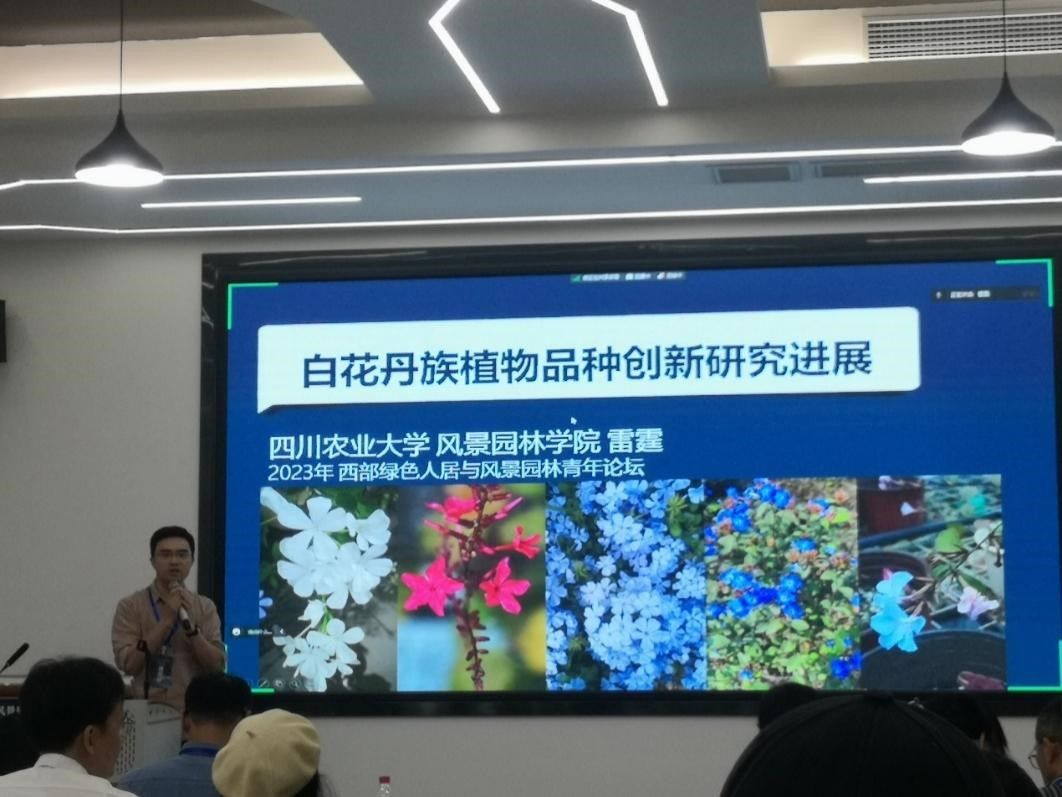 雷霆博士以《白花丹族植物品种创新研究进展》为题,参与“园林植物与观赏园艺”分论坛。报告从白花丹族植物资源收集、育种技术研究、新材料新种质鉴定、新品种选育与应用等方面介绍了十余年来我校白花丹族植物育种工作的进展。该团队收集了5个种,两个变型,共7种植物材料,重点采用杂交育种、选择育种、诱变育种、倍性育种、生物技术育种等手段创制了新材料40余份,产生了多倍体、彩叶、斑叶、矮化、多花、长花期,无机固碳等新性状,选育出岷江蓝雪花新品种“蓝角柱”,目前已在省内多地推广应用。