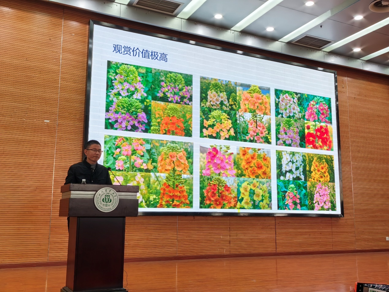 付东辉首先对彩色油菜花观赏性的开发等一系列研究做了介绍,讲述了彩色油菜花的育种历程,分享了在育种过程中遇到的困难,以及如何克服这些困难,通过一代一代地积累,最终得到63个观赏价值较高的彩色油菜花品种;讲述了他们在发现油菜花在实际的景观应用中花期较短(只有30天左右)问题之后,通过喷施各种生物试剂,筛选出了最优配方,使花期延长了10-15天左右;并分享了他们开发一系列油菜花多种功能的思路。随后,付东辉研究员结合他们的实际案例介绍了如彩色水稻、向日葵等其它一些具有观赏价值的农业资源的开发及其在园林中的应用。付东辉精彩的报告为园林相关专业的师生提供了新研究的思路和路径。