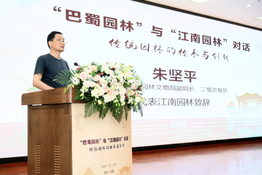 原杭州市园林文物局副局长、二级巡视员朱坚平代表“江南园林”致辞。他谈到,巴蜀园林与江南园林的交流合作是园林行业的一大亮点。两地园林各具特色,优势互补,通过交流与合作,可以相互借鉴、共同提高,具体可从加强园林设计理念的交流、分享两地区园林技术与管理经验、推进园林文化与旅游产业的融合、重视园林教育与人才培养的合作四个方面入手,深化两地的交流与合作。