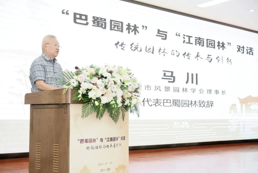 重庆市风景园林学会理事长马川代表“巴蜀园林”致辞。他表示,希望通过本次活动搭建一个园林界同仁们交流互鉴的平台,共同分享研究成果和经验,深入挖掘和传承巴蜀园林与江南园林的精髓与内涵,探讨传统园林在现代社会中的创新与发展,让巴蜀园林与江南园林在传承与创新中相互启发、共同进步。