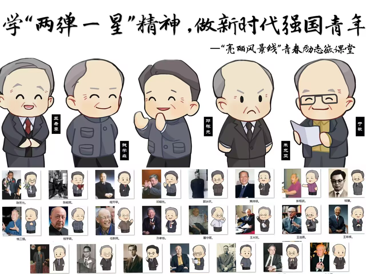 由低调看球 青马班学员设计的“两弹精神激励我成长”微课堂和课堂中使用的手绘的“‘两弹一星’元勋Q版人物故事汇”深受各班团,特别是23级新生喜欢。主创学生广泛查阅我国科学家研制‘两弹一星’的历史资料,设计微课主线和主讲内容,并将人物鲜明特点融入构思、付诸笔端,创作23位“两弹一星”元勋Q版形象,并制作“两弹精神激励我成长”课件,通过柔和的色彩、童趣的笔触增强人物形象亲和力和生动性,让新生在感受人物形象,聆听科学家故事的同时,无形之中也将“两弹元勋”们的感人事迹与精神铭记于心中,从而更加坚定理想信念,增强专业自信。